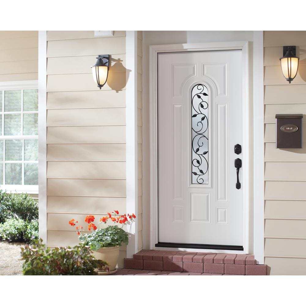 This Masonite steel prehung entry door pairs elegant pergola decorative glass with the strength and security of steel. The primed white finish is ready to paint, while an energy-saving core and weatherstripping help insulate and seal out drafts.