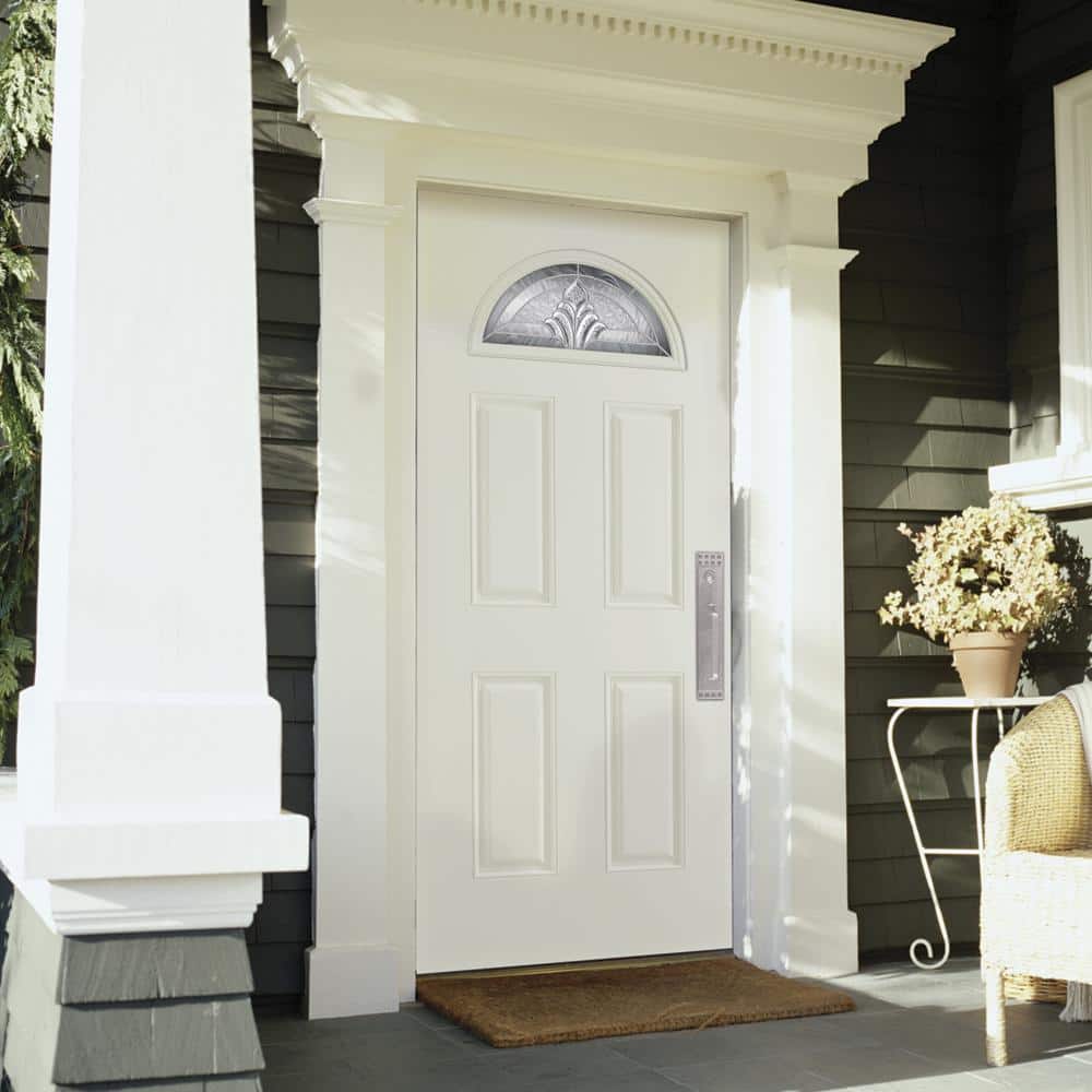 The Masonite Providence Fan Lite Fiberglass Prehung Exterior Door combines the classic look of a wood door with the durability and low maintenance of fiberglass. Featuring a decorative, triple-pane fan lite glass and energy-efficient construction, this door is designed to resist warping, cracking, and denting while enhancing your home's curb appeal. Its primed white finish is ready for painting, making it easy to customize for any entryway.