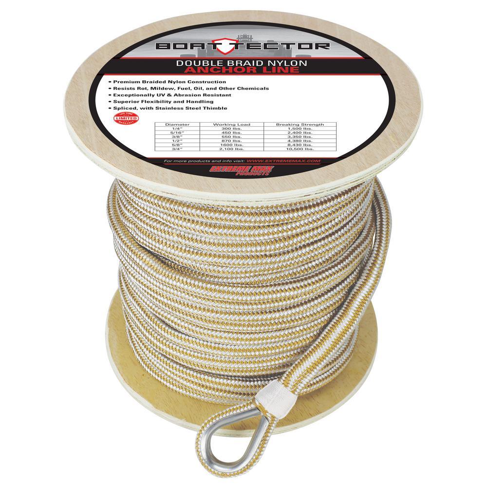 Extreme MAX BoatTector products are designed to provide optimal protection for boats and watercraft. Every item we offer has been carefully selected for its durability and performance in harsh marine conditions. This premium anchor line is ready to use, with a stainless steel thimble on 1-end. Nylon has great strength and shock load resistance, handles easily, and resists sunlight better than all other synthetics. Double braid offers an excellent combination of minimal stretch with excellent shock load reduction. All Extreme MAX BoatTector line and cordage products are designed for optimal utility and durability, and carry a limited lifetime warranty. Working Load Limits shown are guidelines. This product is intended for non-critical consumer applications. Not to be used for overhead lifting, or in applications with a risk of death, personal injury or property damage.