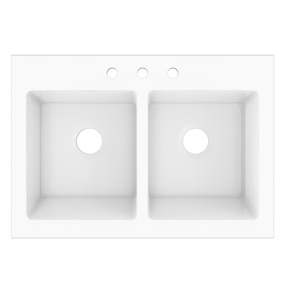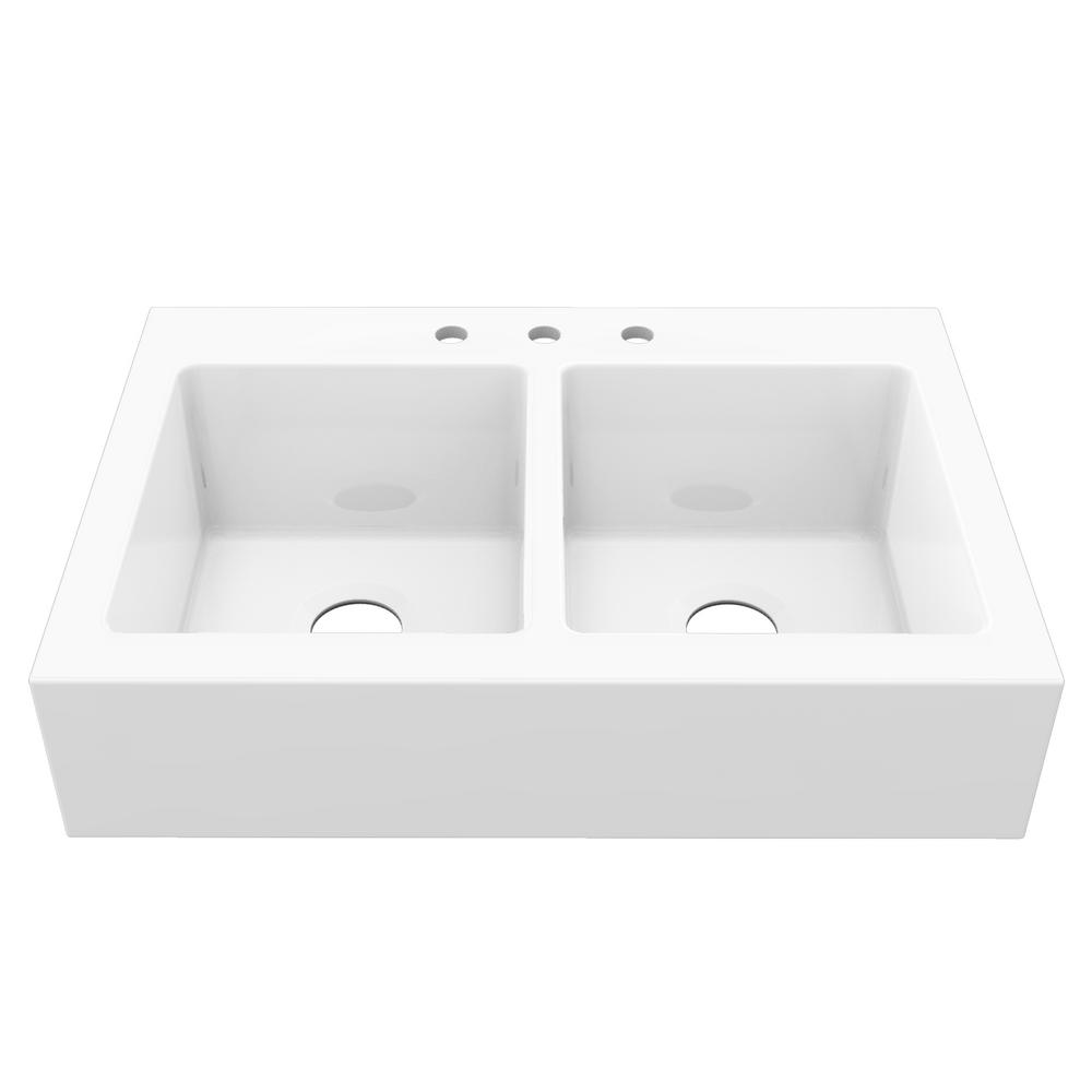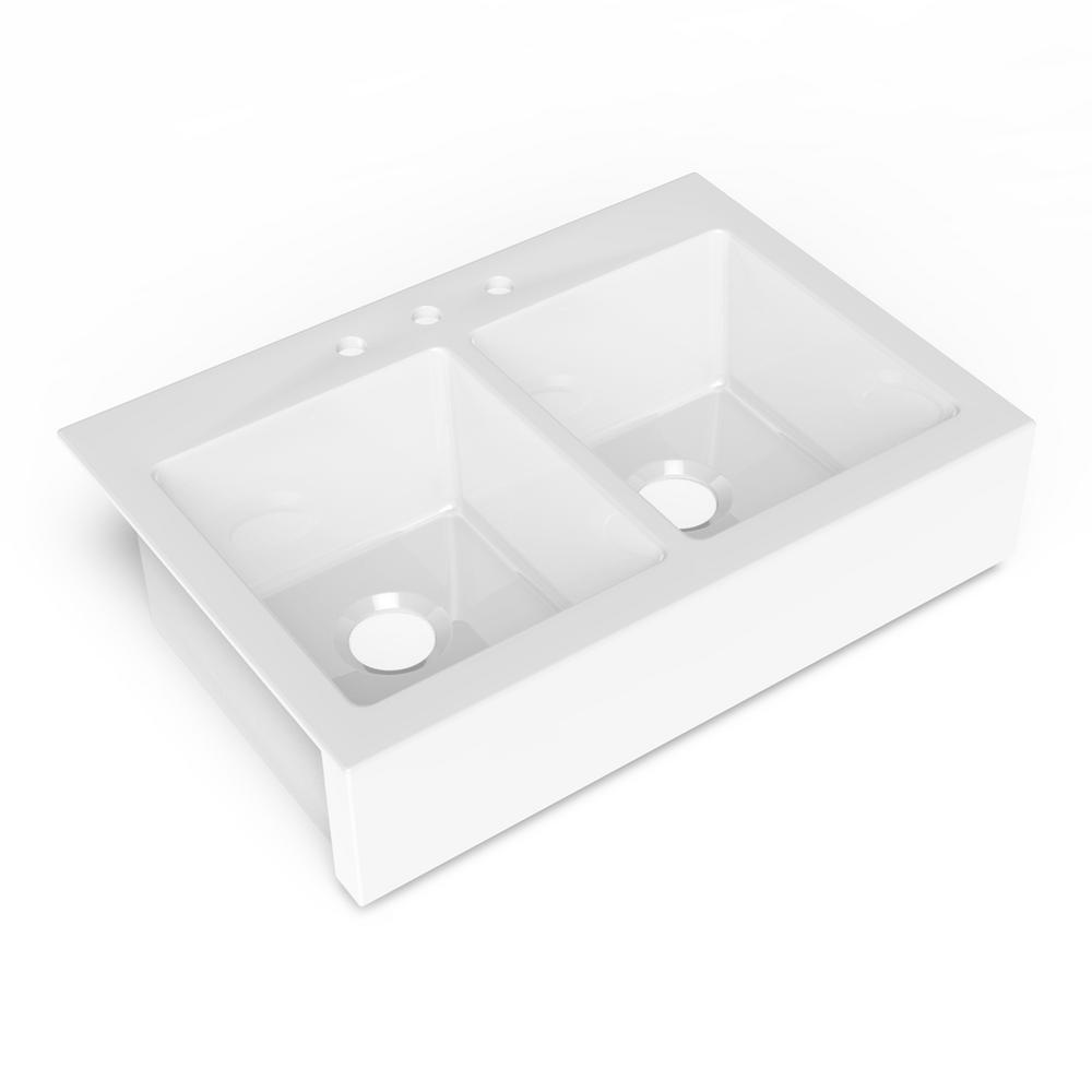 Elevate Quick-Fit Drop-in Farmhouse Fireclay 33.85 in. 3-Hole Double Bowl Kitchen Sink in Crisp White