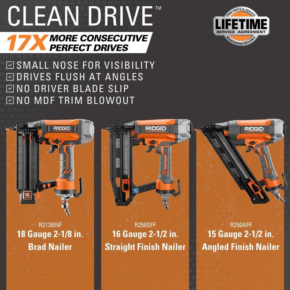 RIDGID introduces the 15-Gauge 2-1/2 in. Angled Finish Nailer. This Angled Finish Nailer delivers consistent professional results with every trigger-pull. Packed with CLEAN DRIVE Technology, this nailer delivers over 17X more consecutive perfect drives versus the competition. This results in less time fixing, and more time working. As part of the new lineup of RIDGID Pneumatic Tools, this is sure to be a staple in contractor's toolboxes. Backed by the Industry Leading Lifetime Service Agreement, the 15-Gauge 2-1/2 in. Angled Finish Nailer includes sample nails, a bag, and an operator's manual.