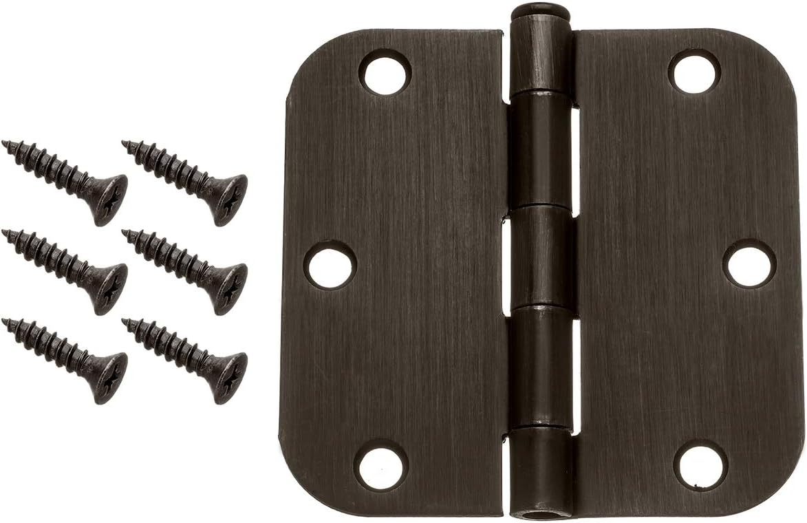 Durable steel door hinges in an oil rubbed bronze finish, designed for 5/8-inch corner radius doors. Each hinge includes matching screws for straightforward installation—ideal for refreshing interior doors across the home.