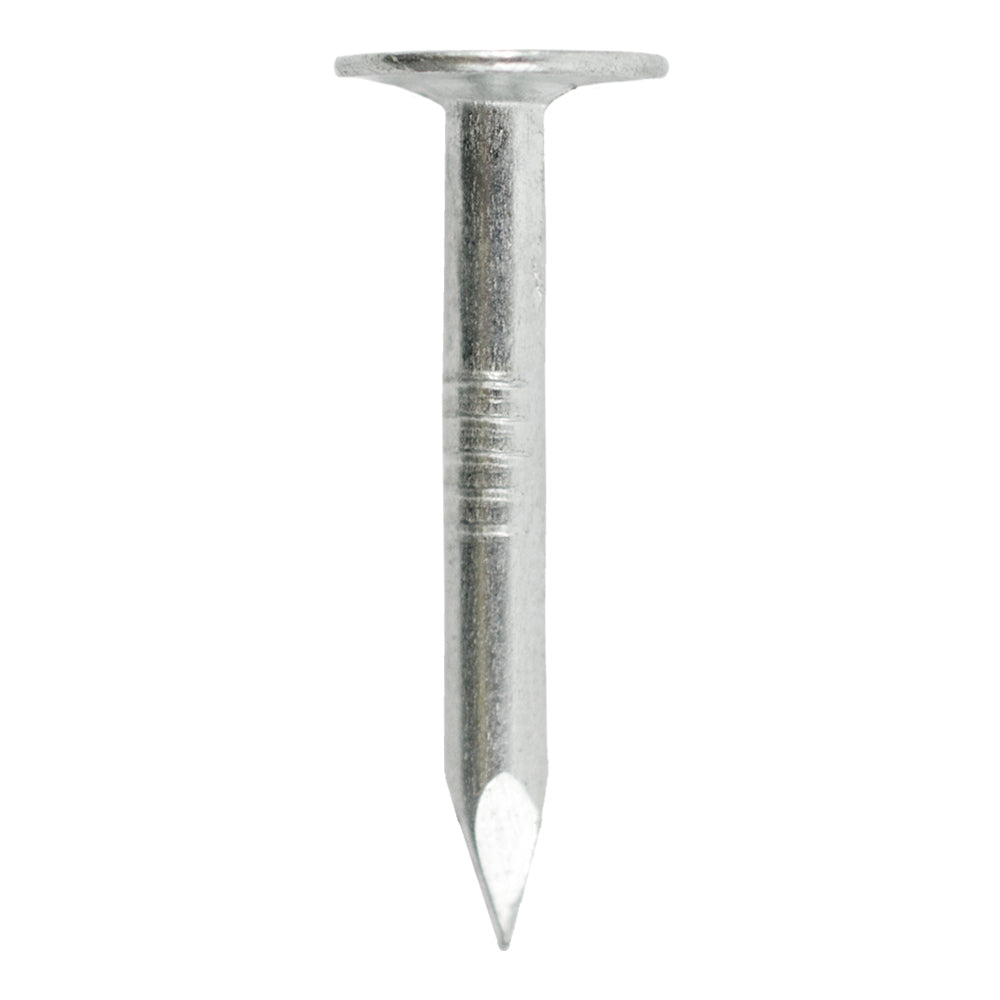 Electro-galvanized steel roofing nails with wide flat heads for secure shingle attachment. Smooth shank and diamond point drive easily while resisting corrosion for dependable roof installs.