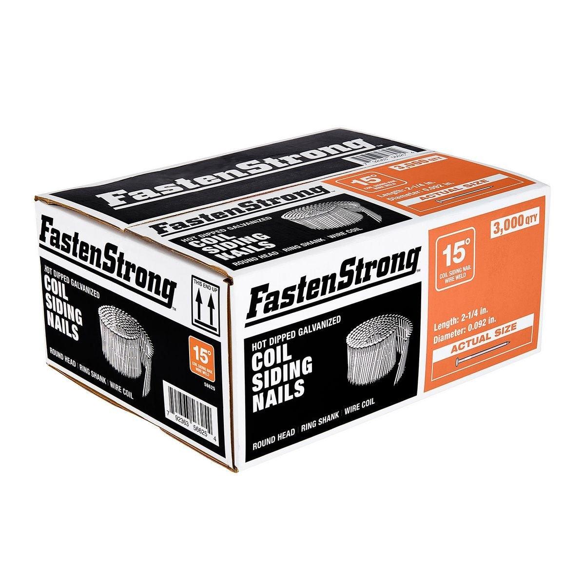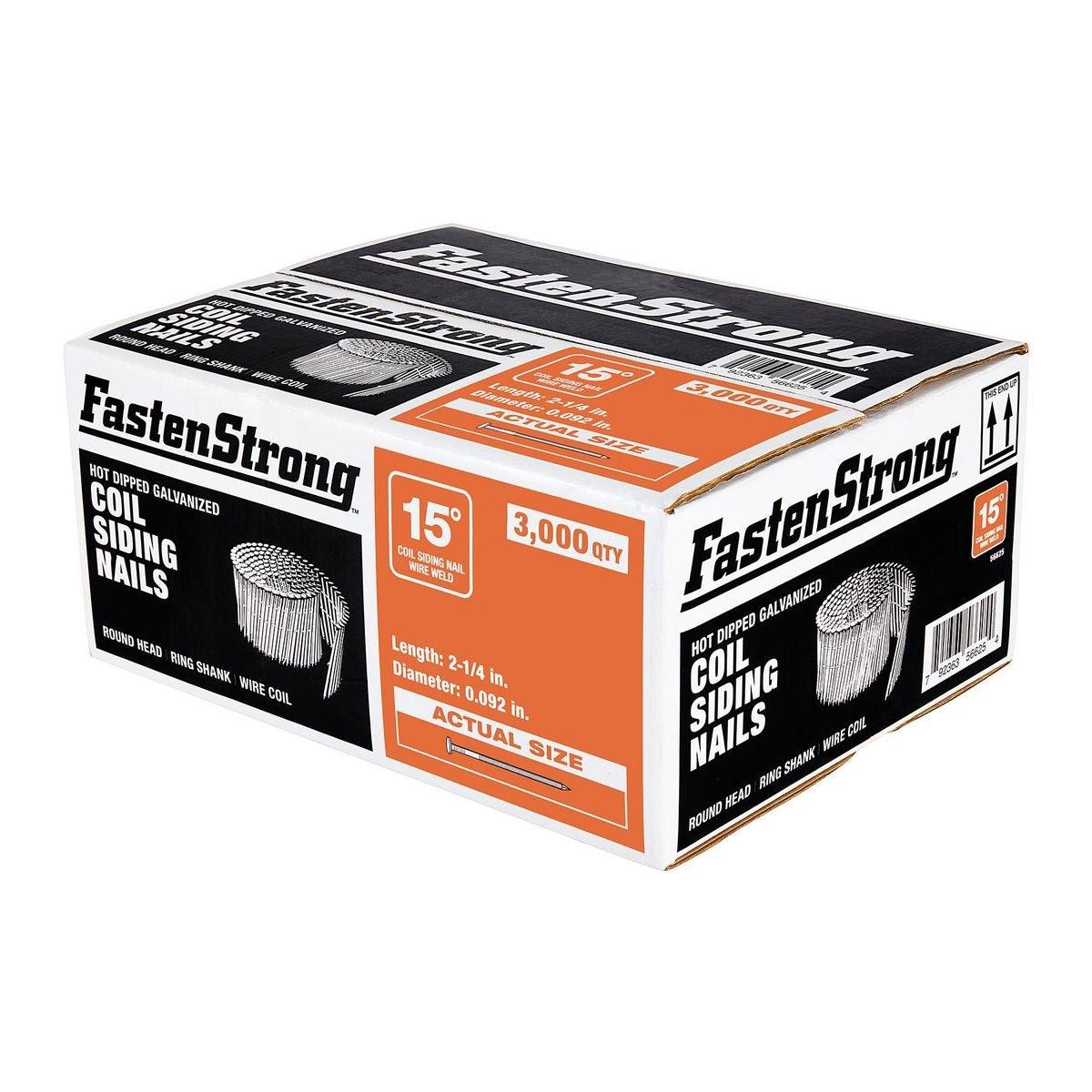 FastenStrong™ galvanized coiled siding nails are designed for use in 15° siding nailers The nails feature wire weld collation and a ring shank.