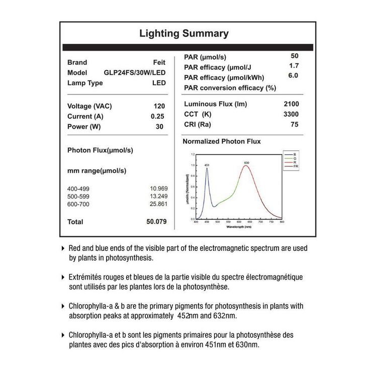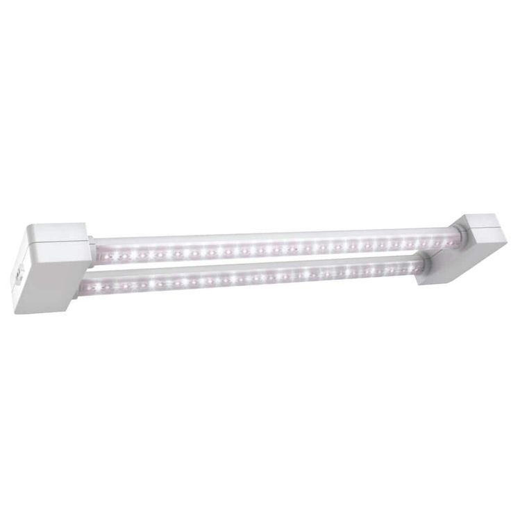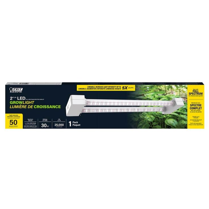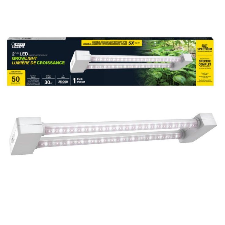 Feit Electric's 2 ft. Dual LED Full Spectrum Grow Light only uses 30-Watt and comes fully assembled with an ultra-light weight design that can be used in hanging or flush mount installation. This no-humming LED emits precise wavelengths and color for superior photosynthetic response in the 450nm blue spectrum preferred for vegetative growth. There are no lamps to dispose of or replace with this 2 ft. Dual Lamp with its cool operation that prevents burning of leaves compared to high pressure sodium lamps. Includes two 6 in. hanging wire harnesses as well as a 5 ft. plug-in cord and easy on/off light switch. Durable smooth edge housing and light weight design facilitates the installation process. Up to 8 of these fixtures can be linked together with its 5 ft. cord enabling easy and flexible runs.