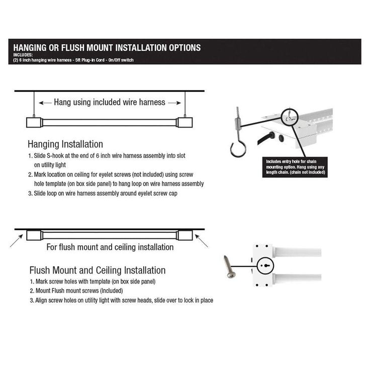 • Parts include one 2 ft. fixture with ON/OFF switch, 2-mounting screws, two 6 in. hanging cables, one 5 ft. plug-in cord
