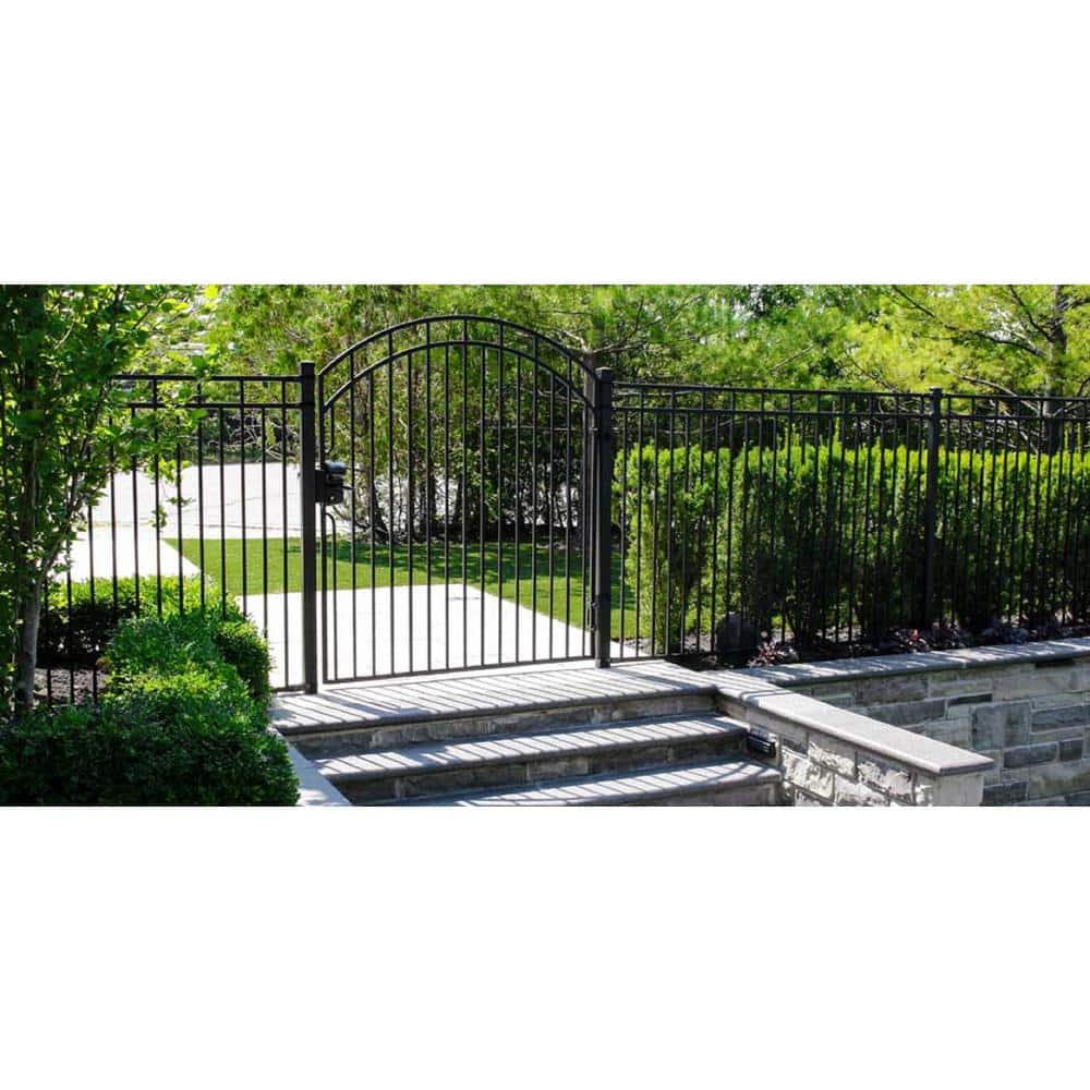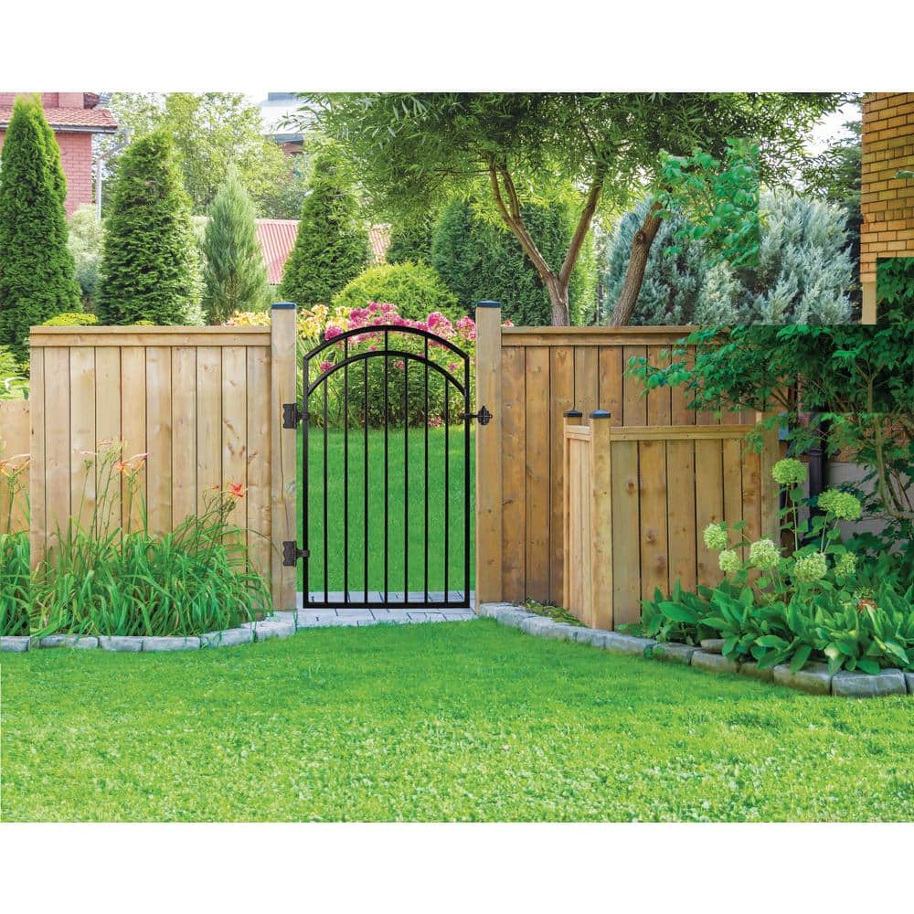 Upgrade your outdoor space with the Benitoite Profile Black Iron Center Point Arched Top Fence Gate. This stylish gate features a sleek design and durable galvanized steel construction, combining aesthetic appeal with the longevity needed for lasting performance. It includes self-closing hinges and comes pre-assembled for easy installation.