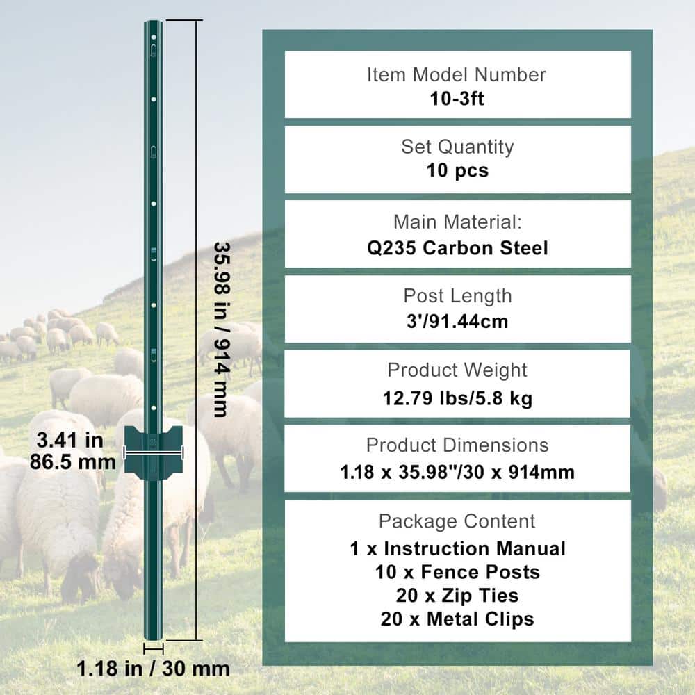 VEVOR 3 ft. Fence Post, T-Post Heavy-Duty Metal Fence Posts, Sturdy Steel Fence Stakes for Garden Yard, Lawn, Green (10-Pack)