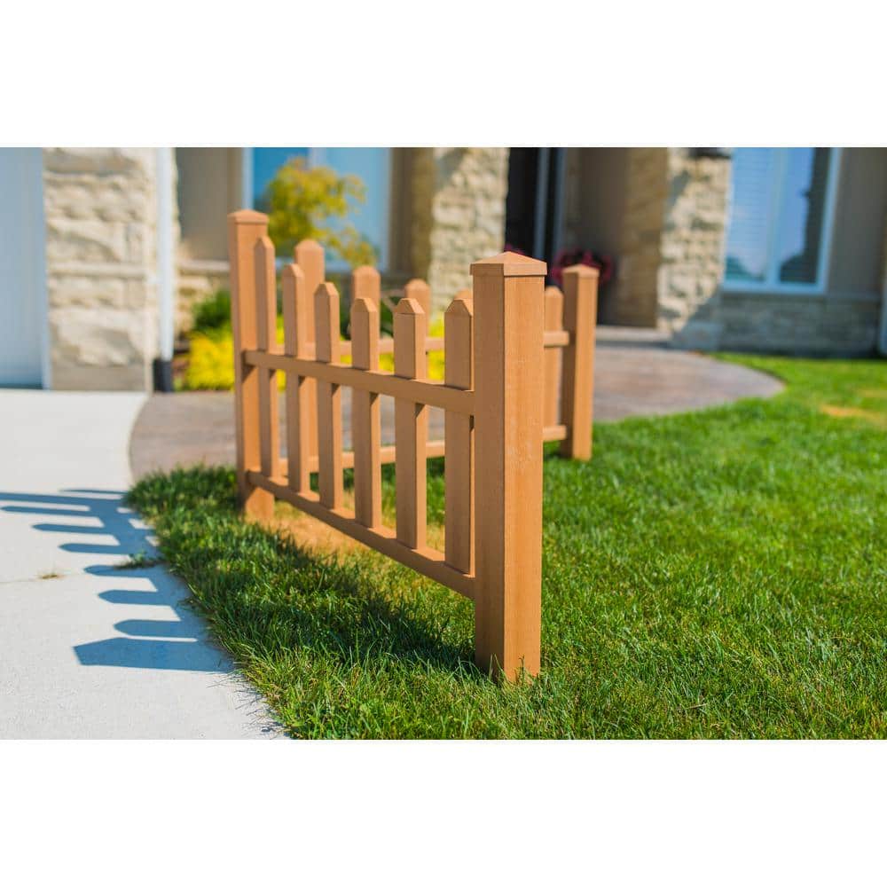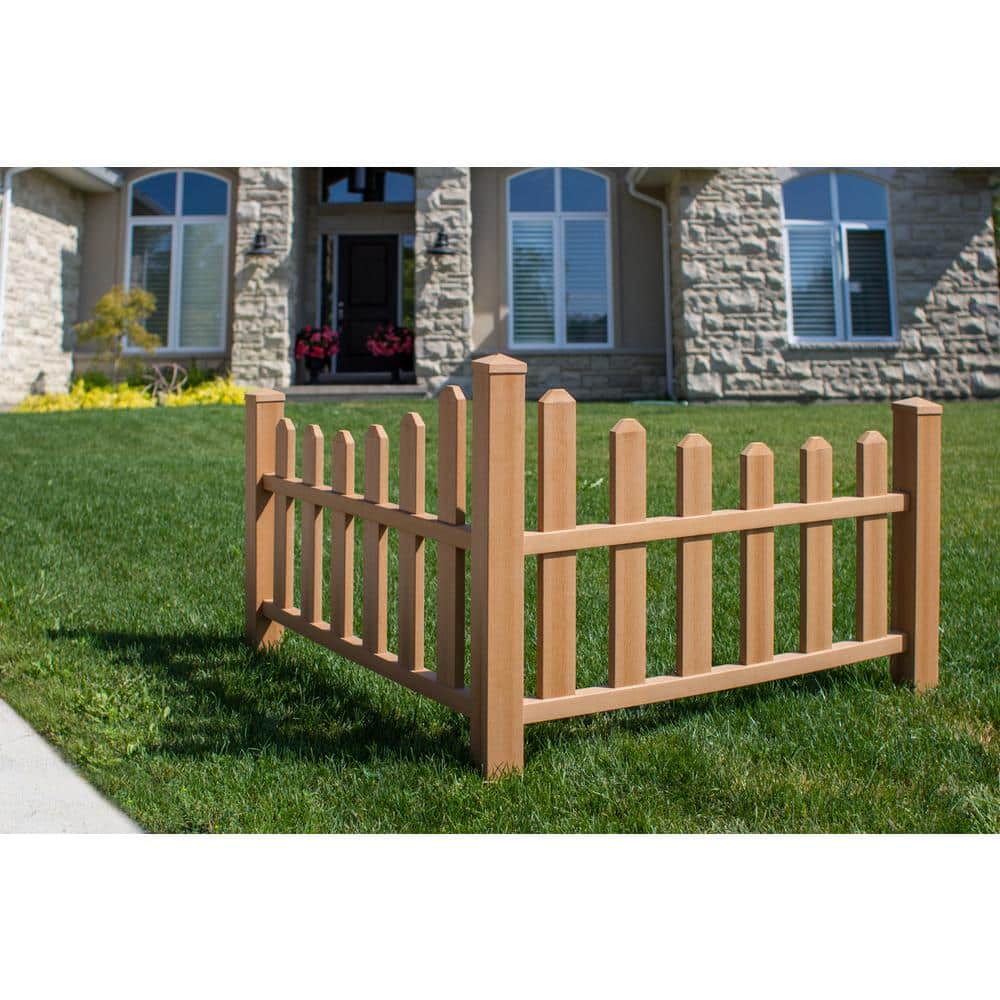 The VITA Country Corner Embossed Vinyl Picket Fence in brown is a charming and durable addition to any outdoor space. Designed for ease of installation and maintenance, this BPA and phthalate-free vinyl fence elevates your garden or driveway with a timeless, rustic aesthetic.