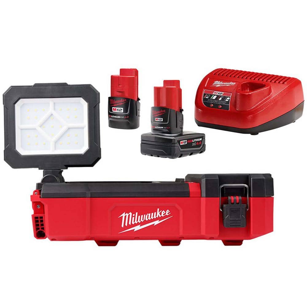 Milwaukee M12 12V Lithium-Ion Cordless PACKOUT Flood Light with USB Charging and M12 XC 4.0 Ah Battery Pack