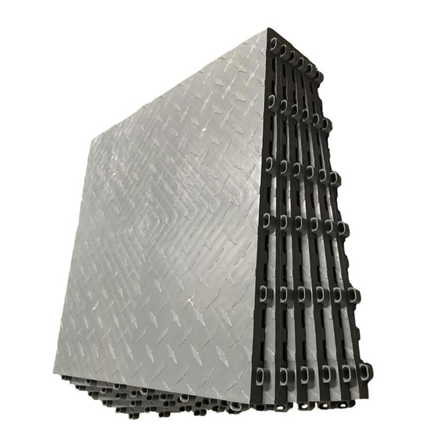 Pack contains 6 tiles/covers 10.32 square feet (each tile is 15.75 -in x 15.75 -in x 0.63 -in) DIY install diamond plate Easy to clean polished diamond plate design Stands up to heavy vehicles and the toughest working garage environments Resistant to auto fluids, hot tires and moisture Color true UV stabilized materials Remove any tile from anywhere in the floor Limited 3 year warranty