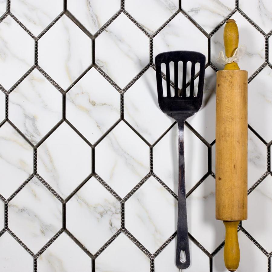 Abolos Nature 10-Pack Calacatta Gold White/Matte 12-in x 12-in Matte Glass Honeycomb Marble Look Wall Tile