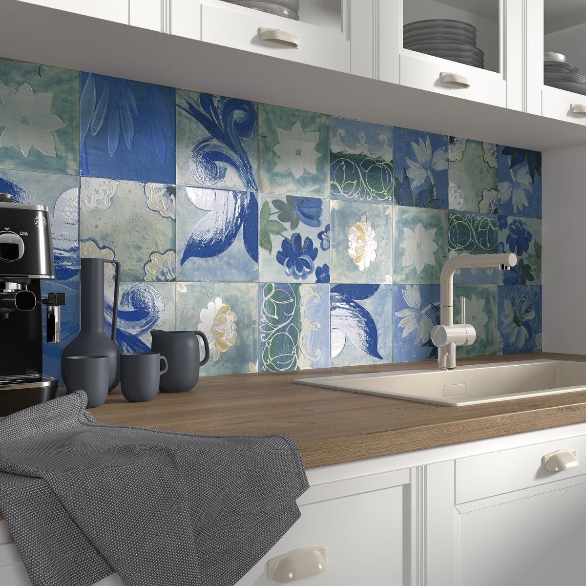 The Angela Harris Wilder Portofina Decor Tile features a stunning botanical design with a hand-painted look, perfect for creating captivating murals or unique patterns. Sustainably made in Spain, this tile combines eco-friendly production with designer style.