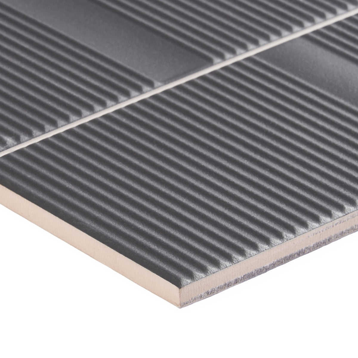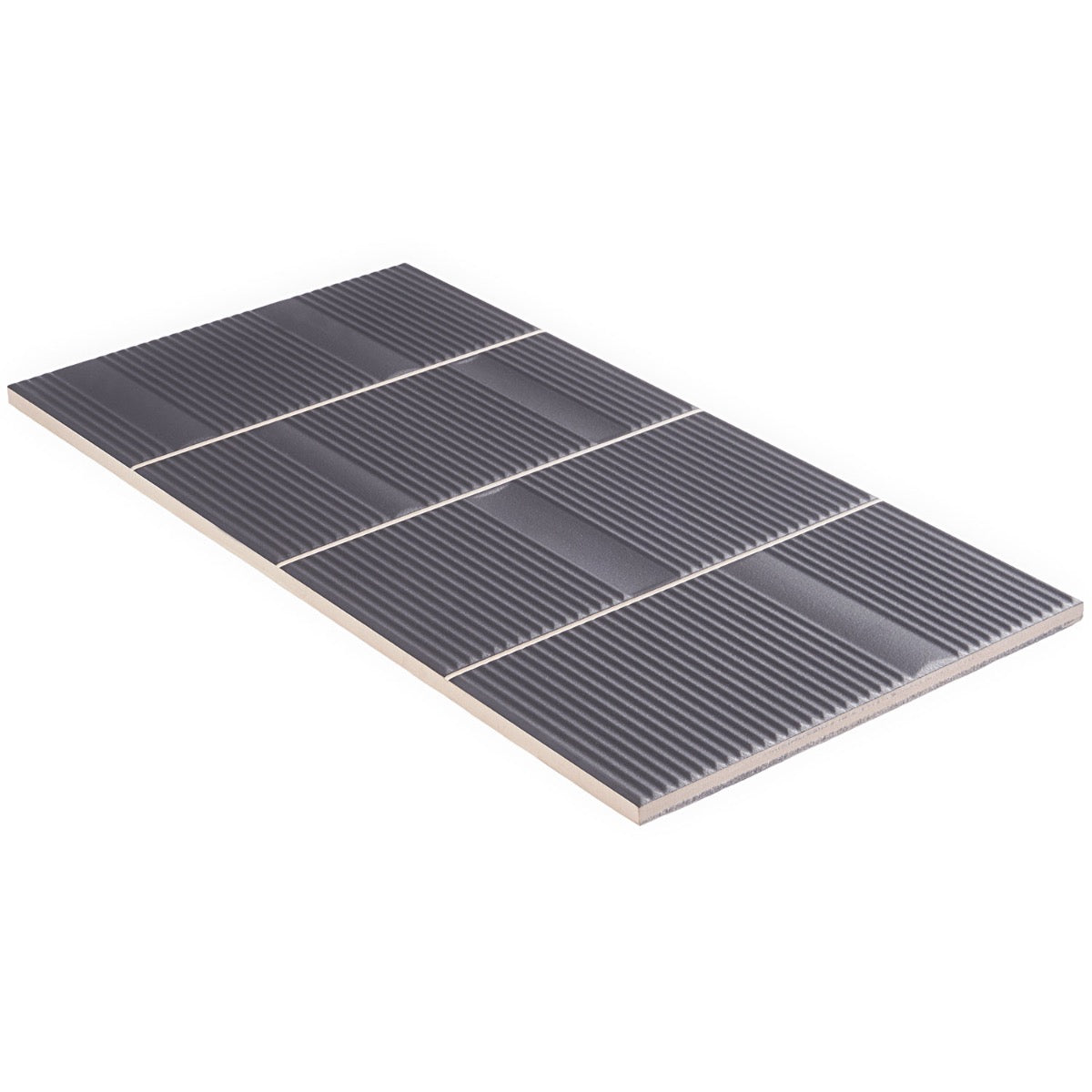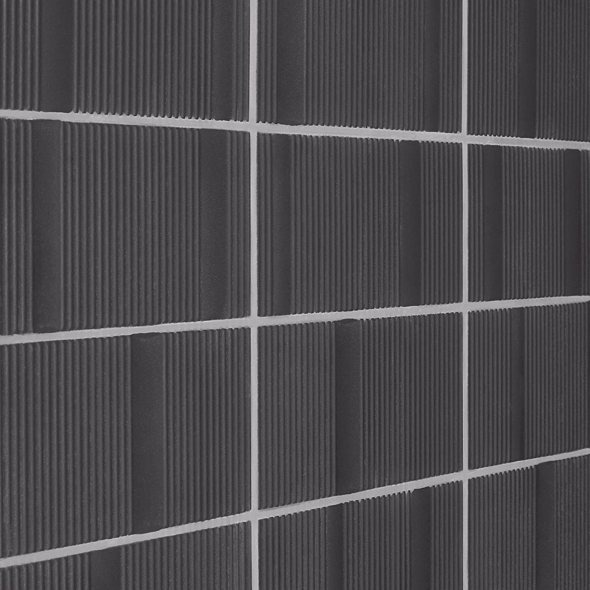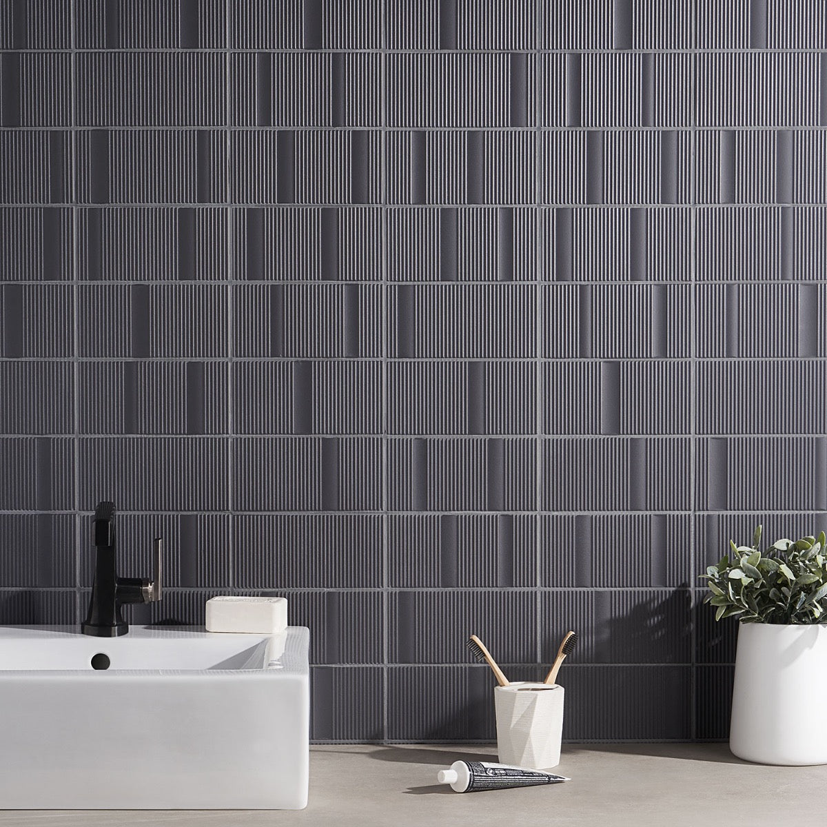 The Division Antracite Black 8x16 Fluted Matte Ceramic Tile features a unique ribbed surface with a rich black matte finish. Its asymmetrical relief pattern adds a modern and artistic touch to any wall.