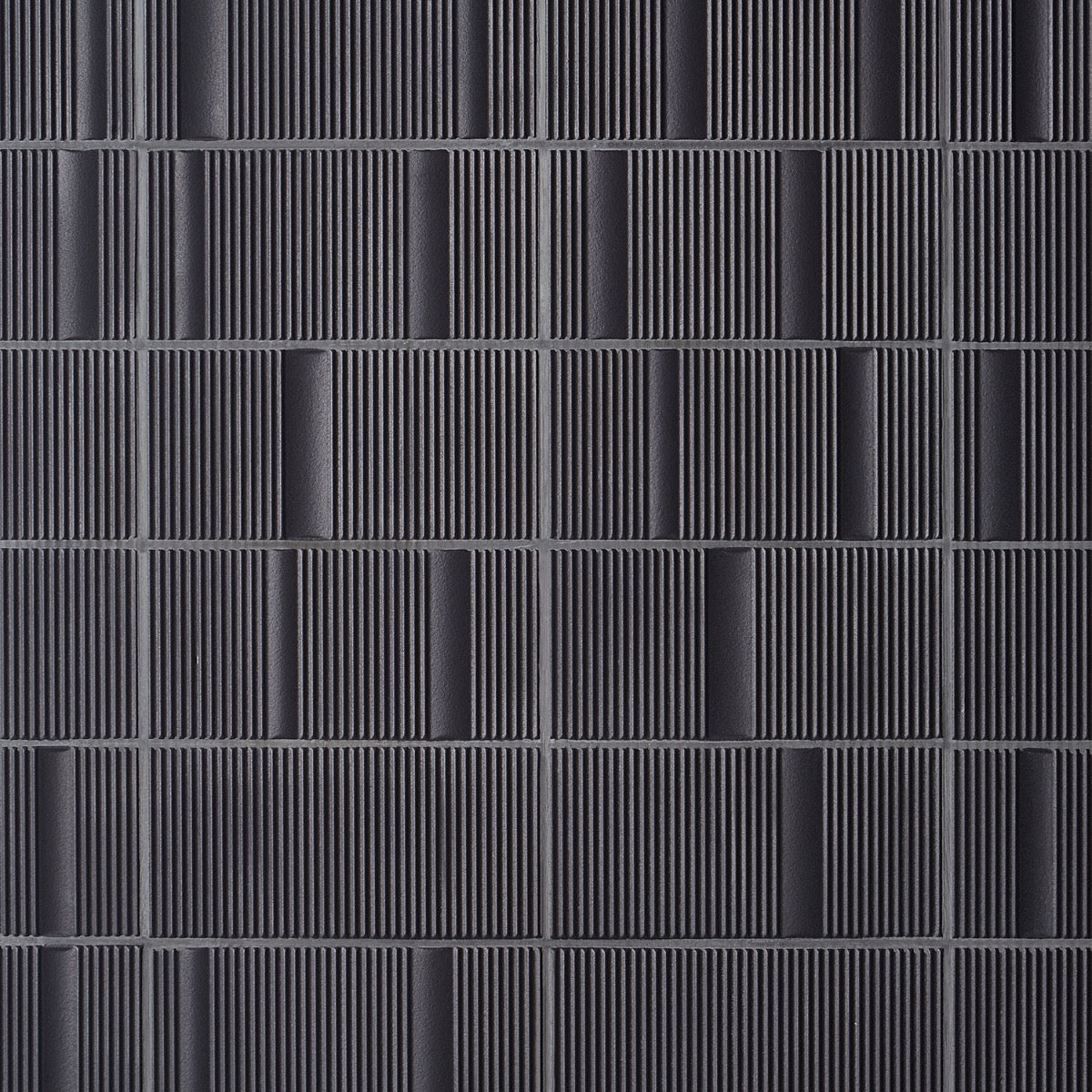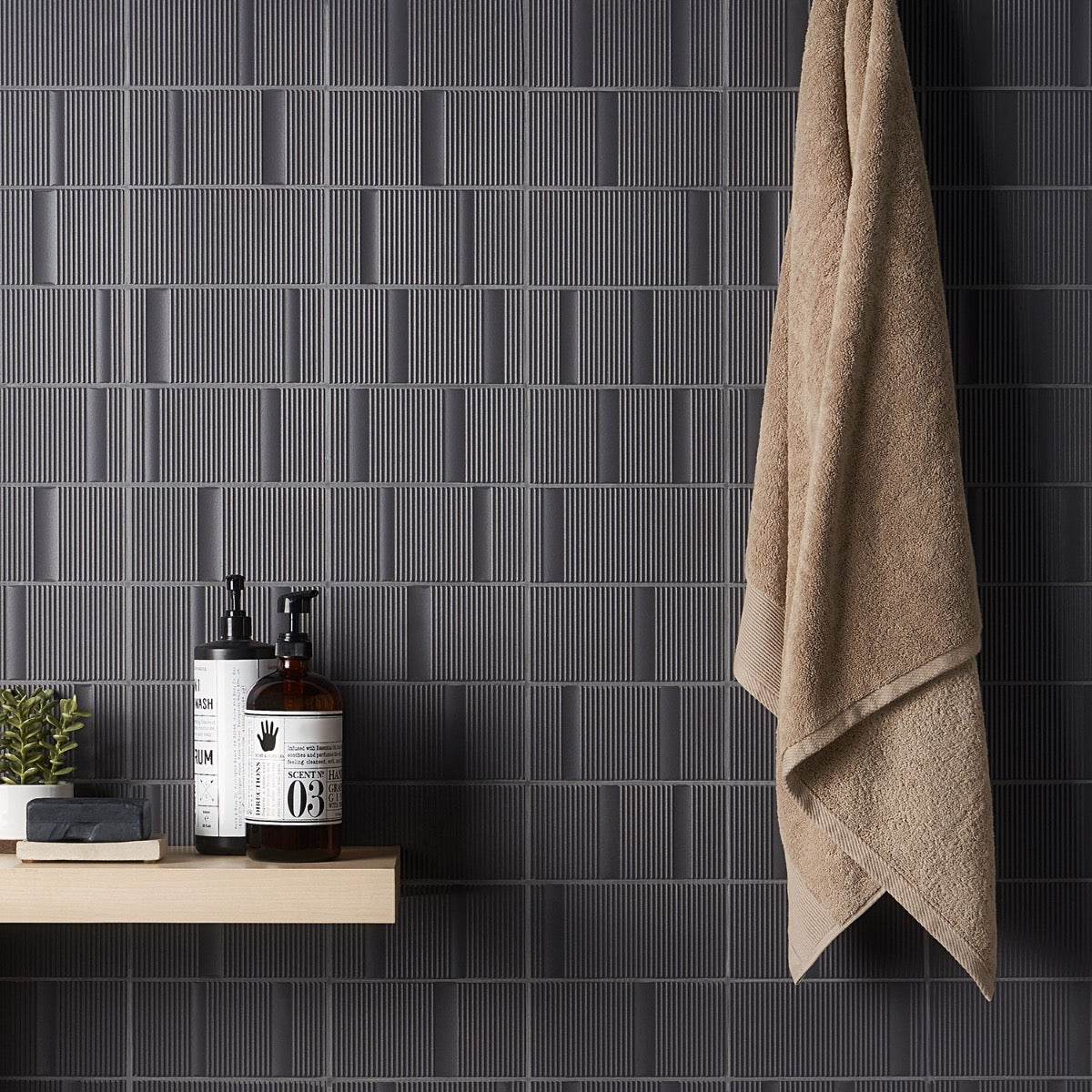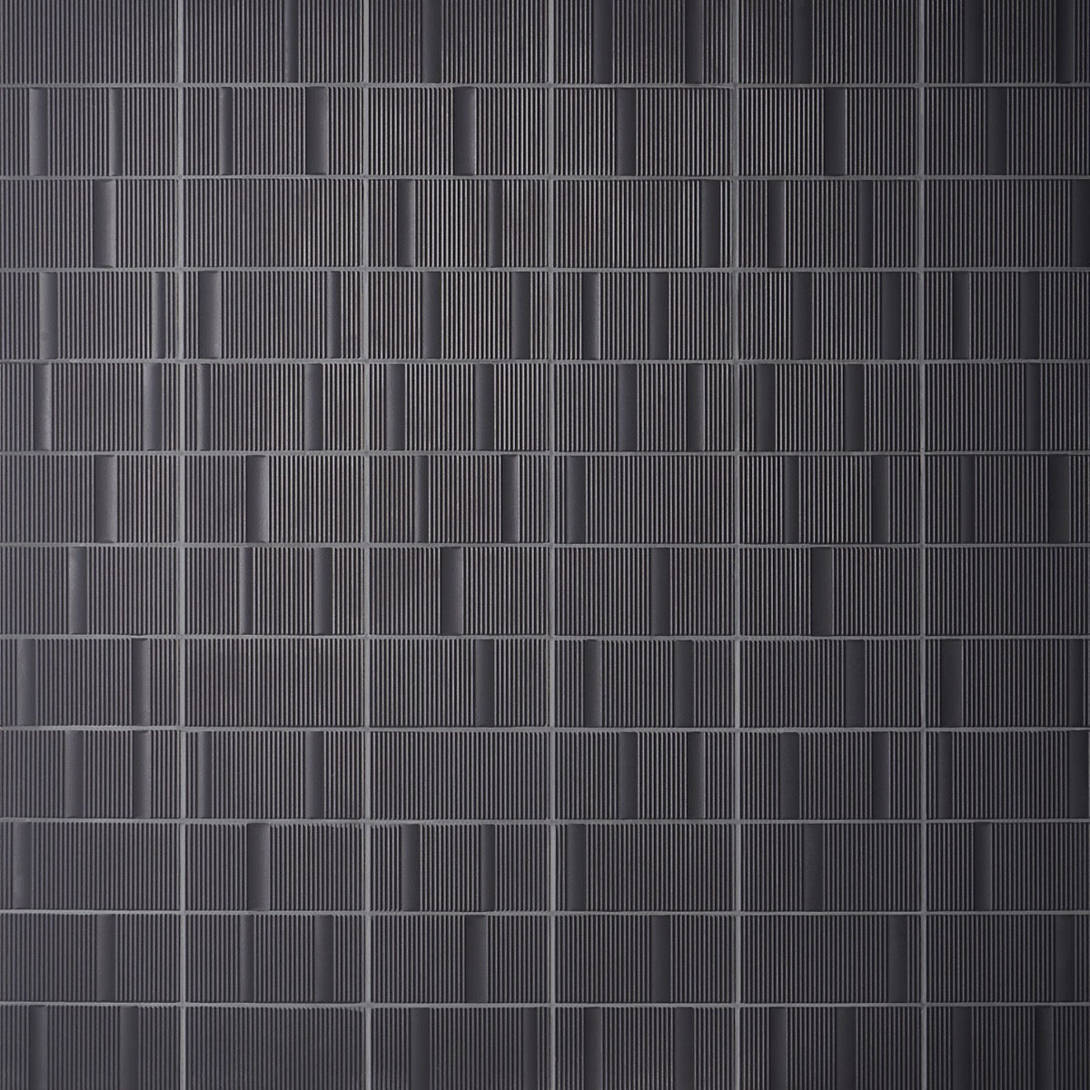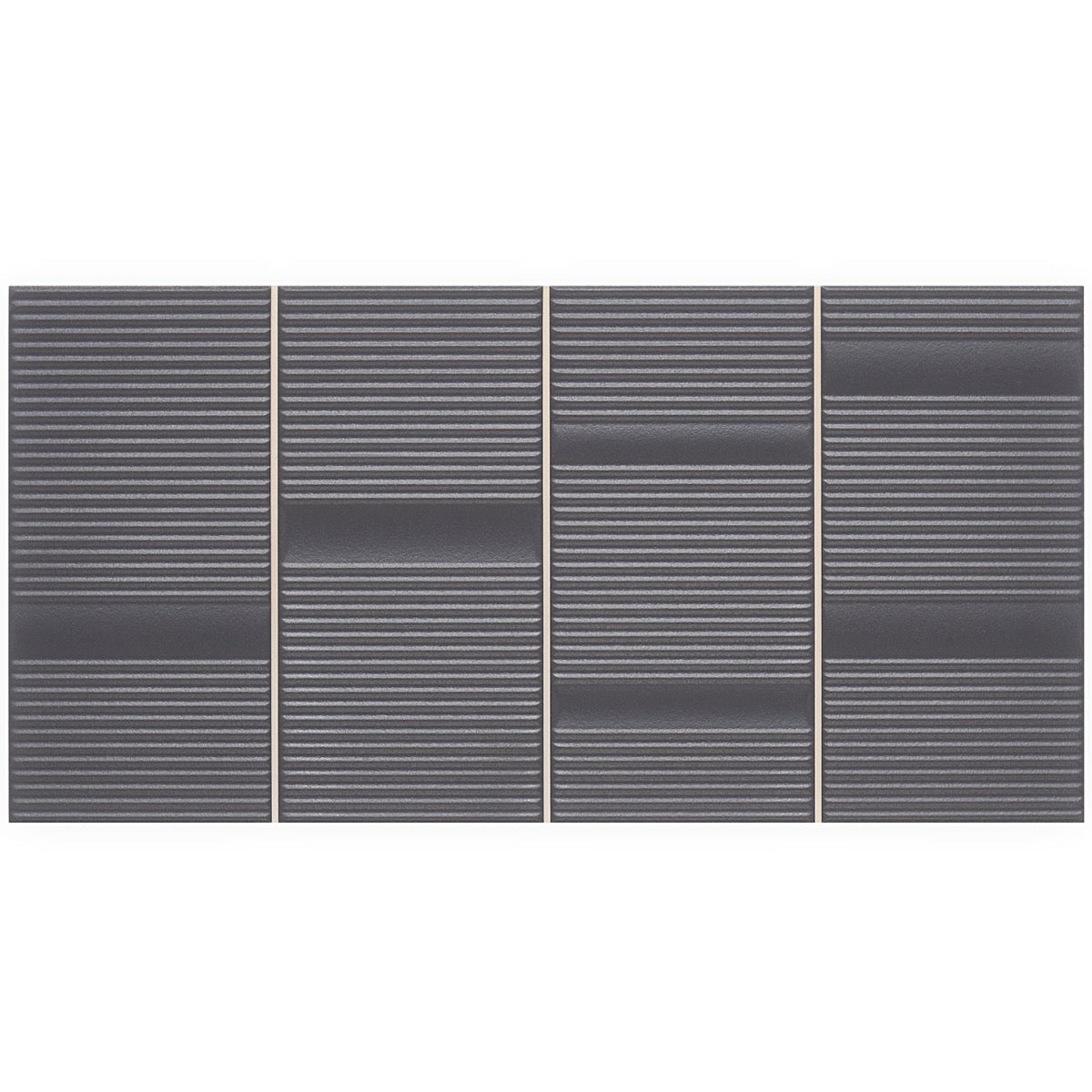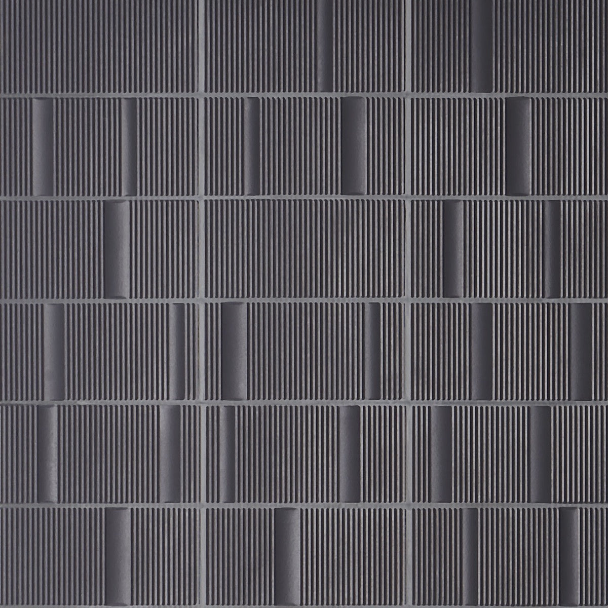 The Division Antracite Black 8x16 Fluted Matte Ceramic Tile features a unique ribbed surface with a rich black matte finish. Its asymmetrical relief pattern adds a modern and artistic touch to any wall.