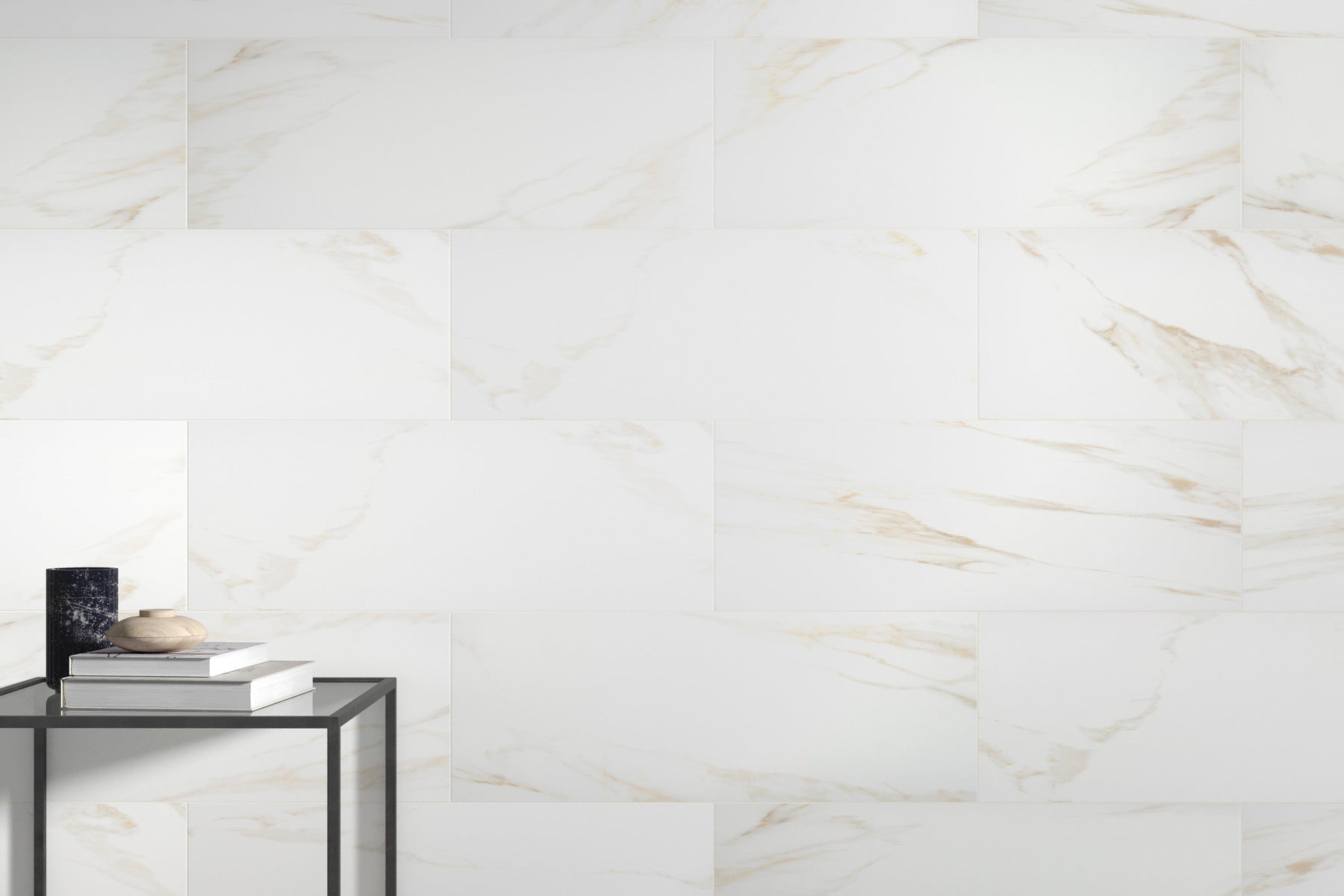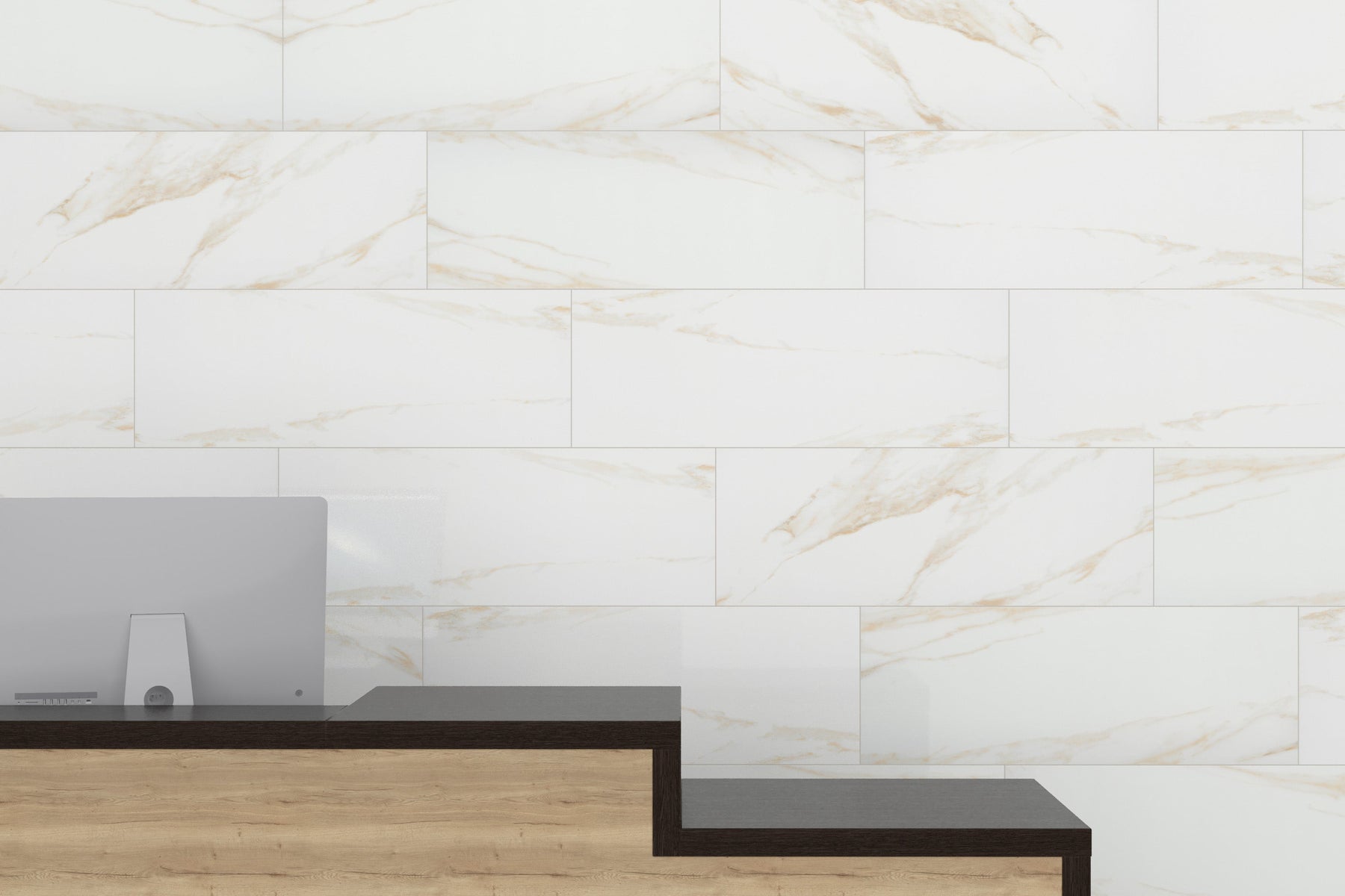 A: This specific 12x24 white piece is the glossy wall tile; Sculpture also offers matte floor tiles to coordinate.