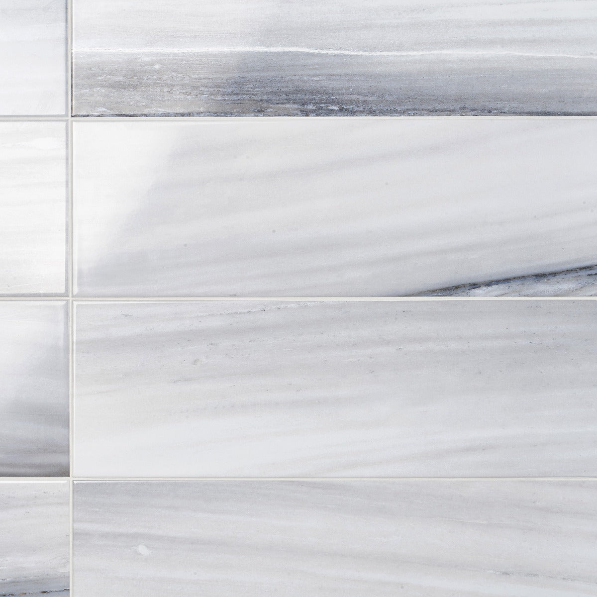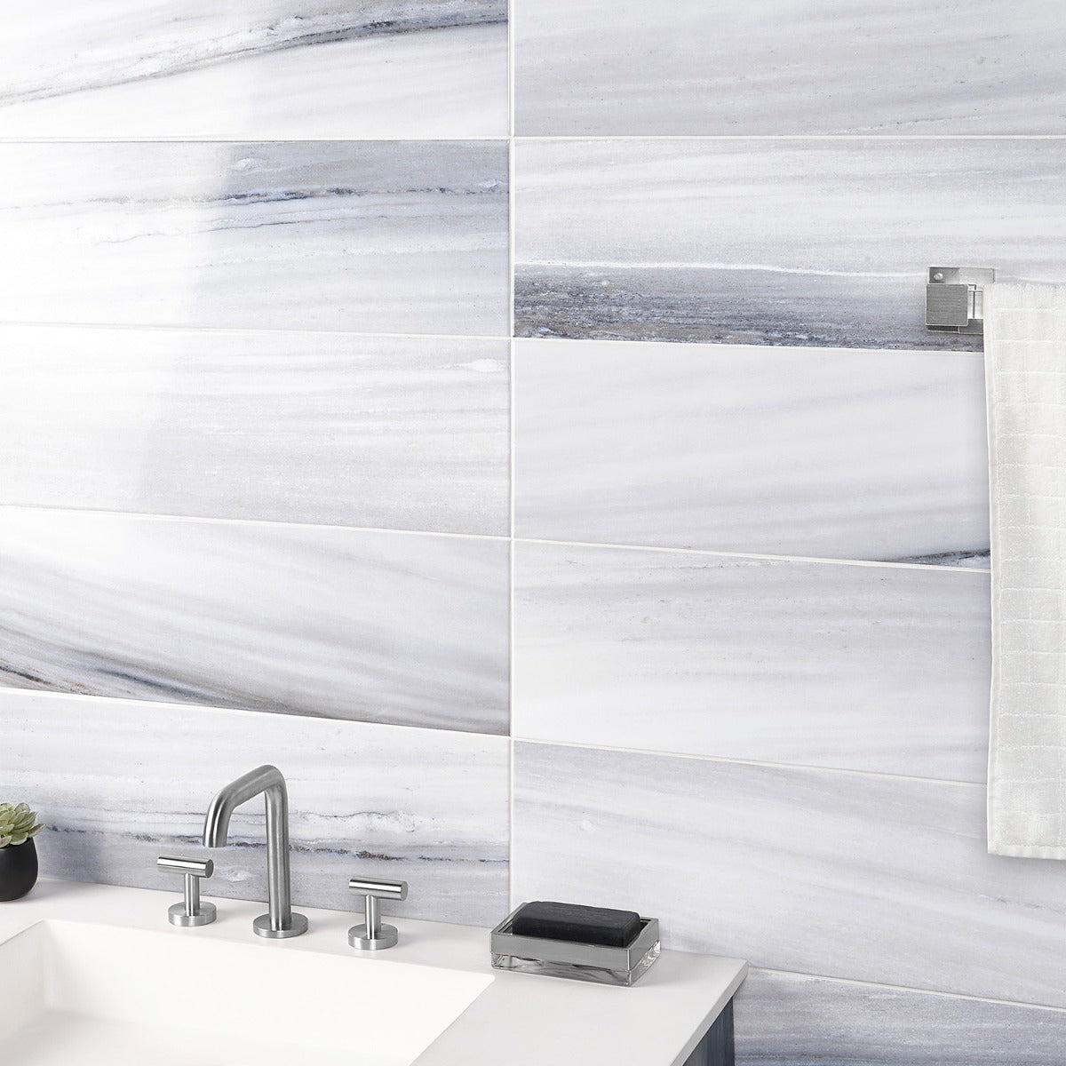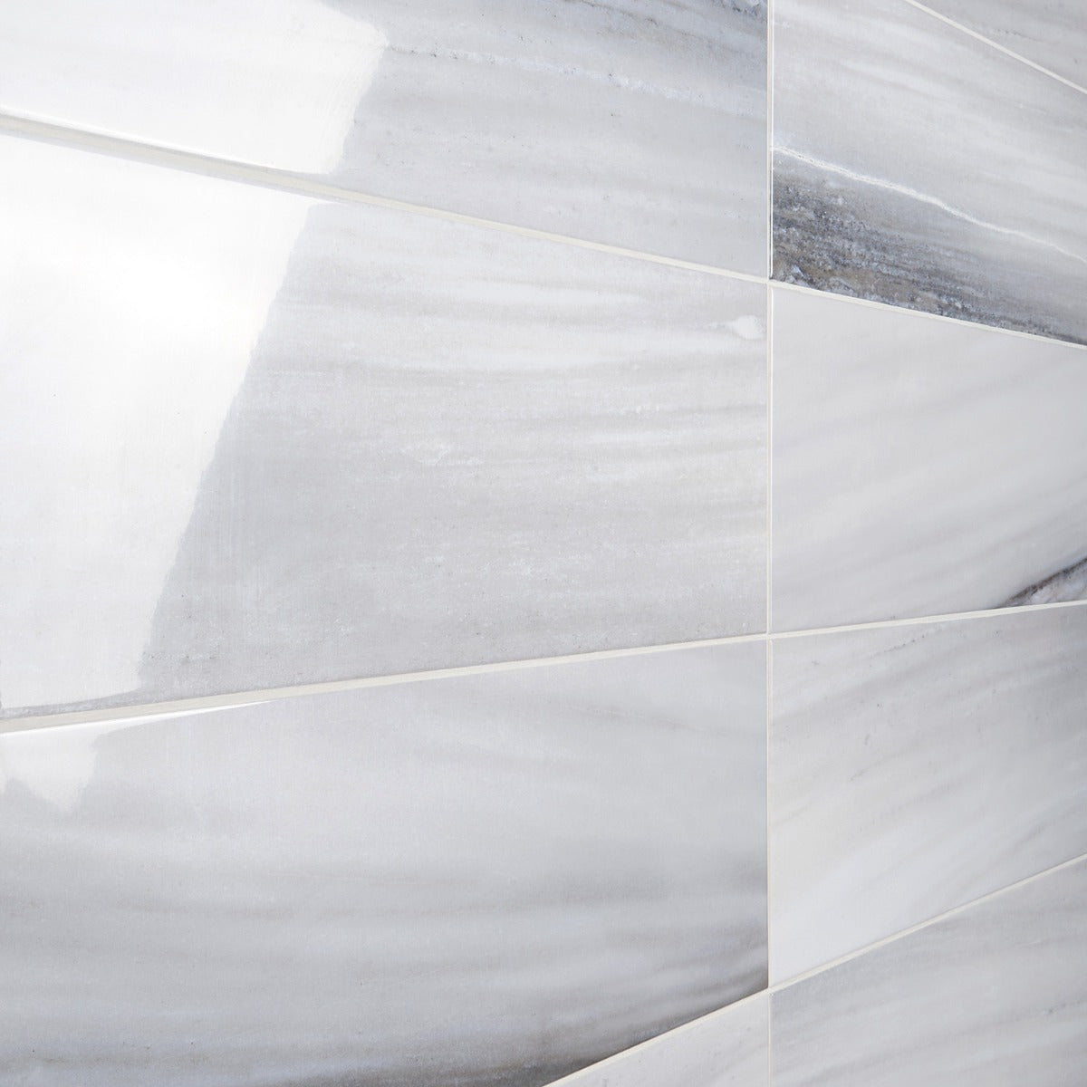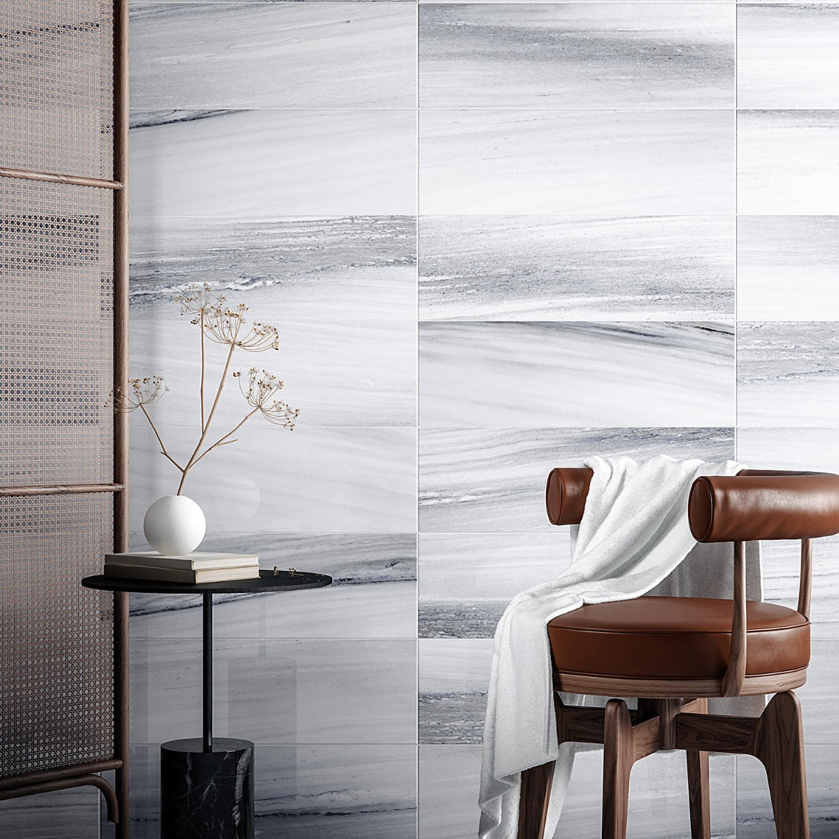 A: The tile is inspired by high-grade marble, featuring a cool-toned palette with delicate veining.