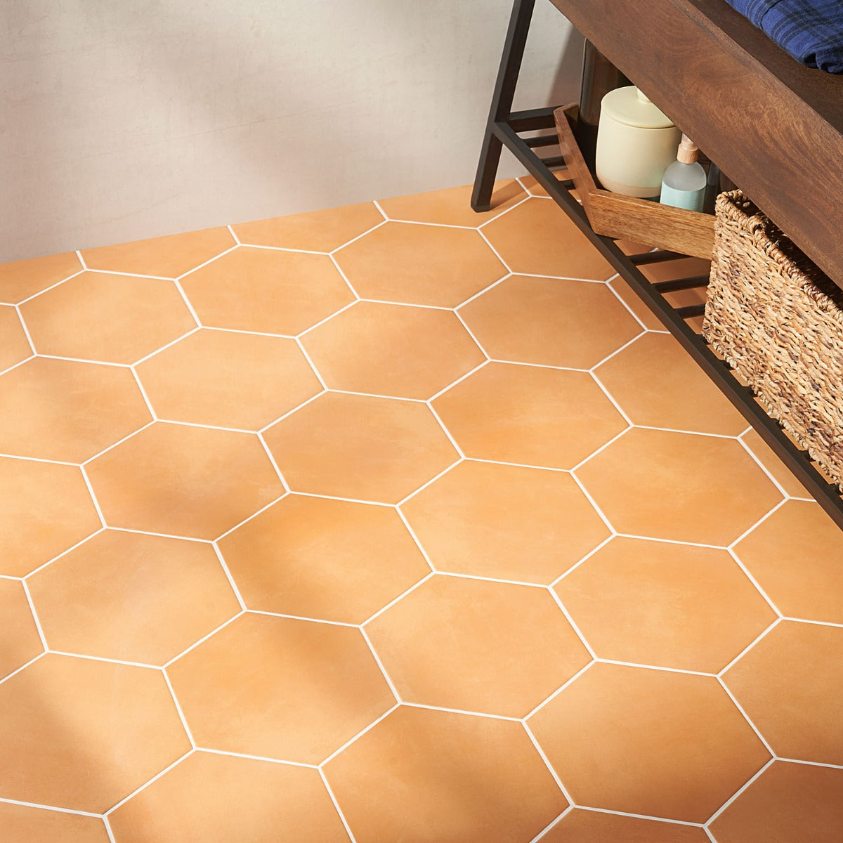 The HexArt Orange 8" Hexagon Matte Porcelain Tile brings a burst of vibrant color to your space with its cheerful orange hue and classic hexagon shape. Made in Spain, this durable porcelain tile is perfect for floors, walls, and even showers, offering a stylish and easy-to-maintain solution.