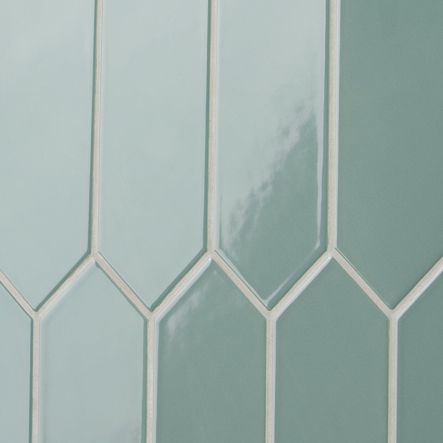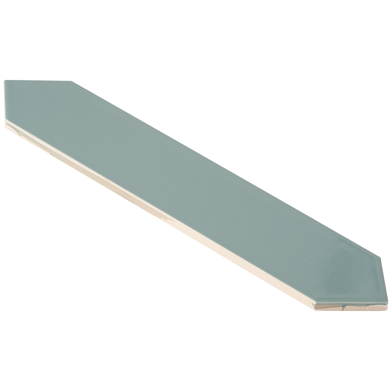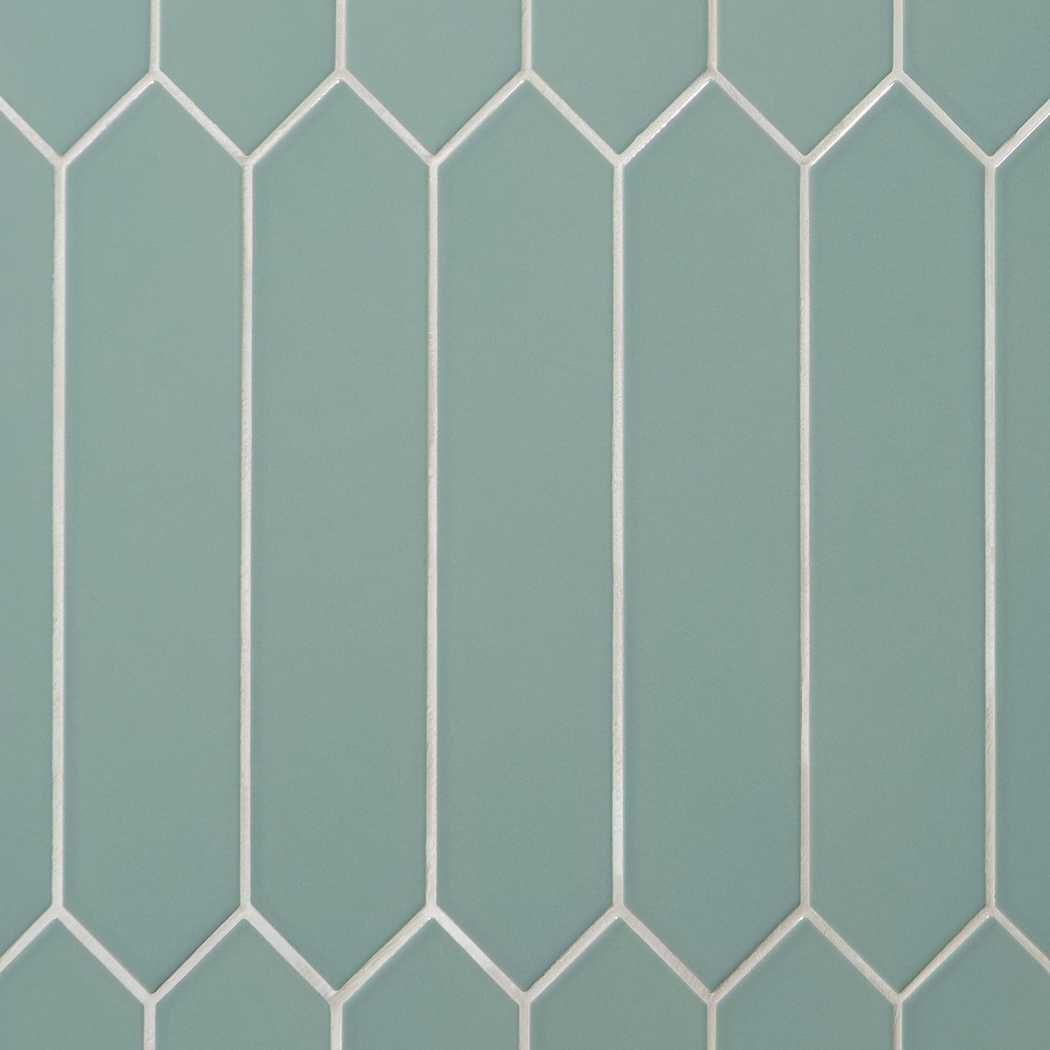 The Kent Jade Green Ceramic Tile features a polished finish and elongated picket hexagonal shape, perfect for accent walls or kitchen backsplashes. Its natural green tone adds a subtle twist to any space.