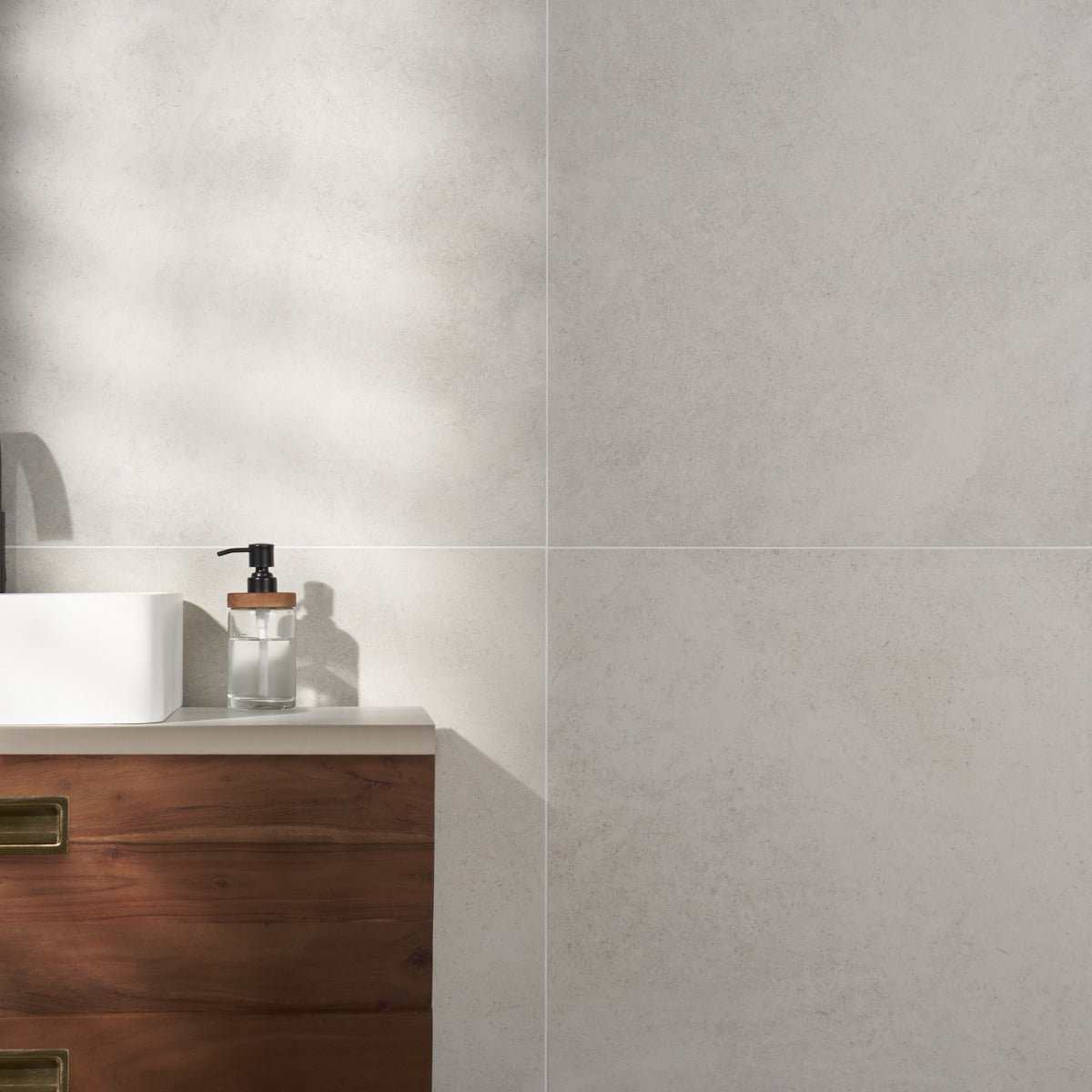 The Perla White Matte Porcelain Tile offers a sophisticated limestone look with subtle beige and ivory veining. Its large 24x24 format and matte finish make it ideal for creating seamless, modern spaces.