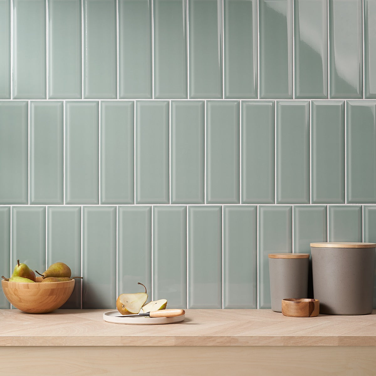 The Rise Sage Green Subway Tile combines a classic design with a soothing green hue and a glossy finish. Its beveled edges add depth and dimension, making it a perfect choice for kitchens and bathrooms.