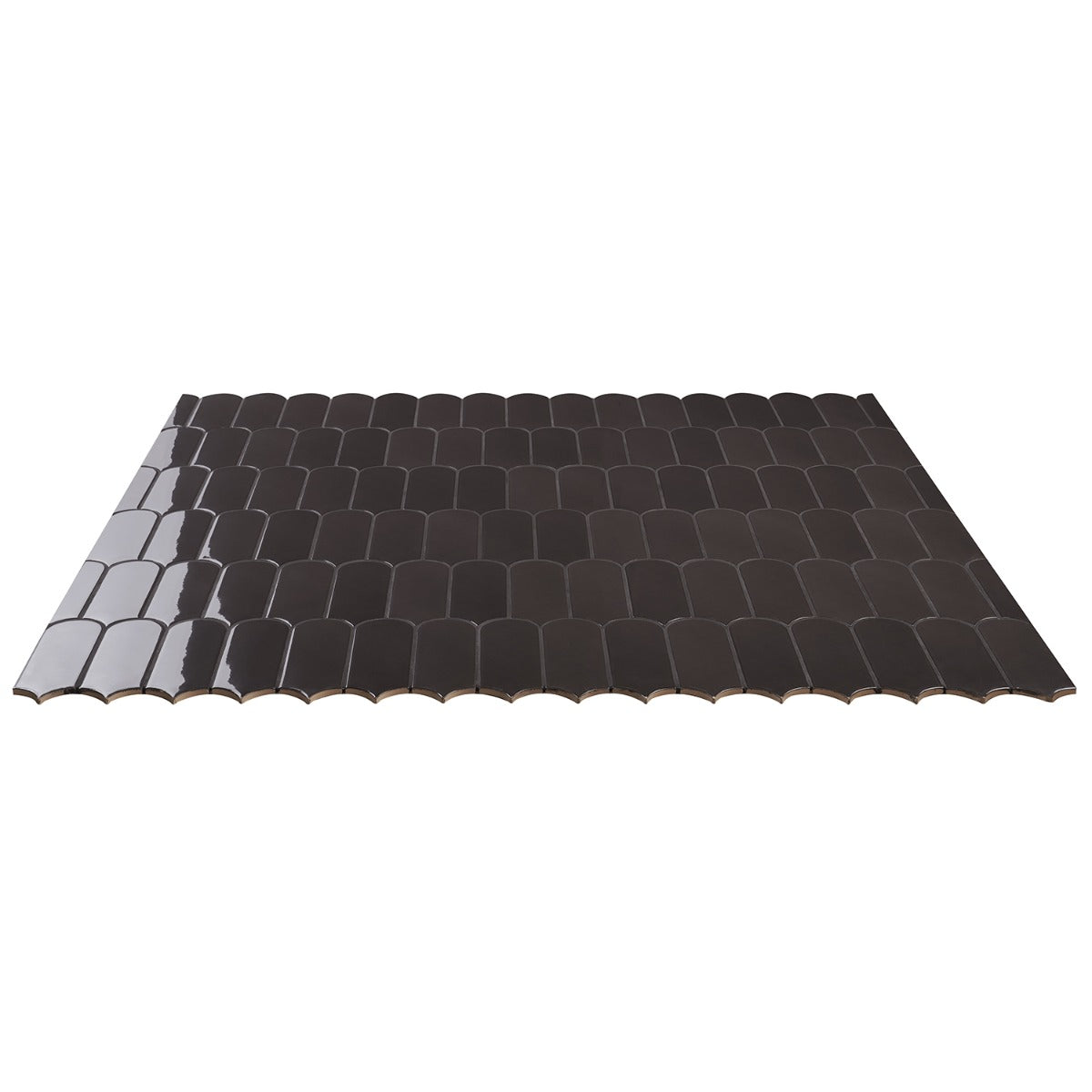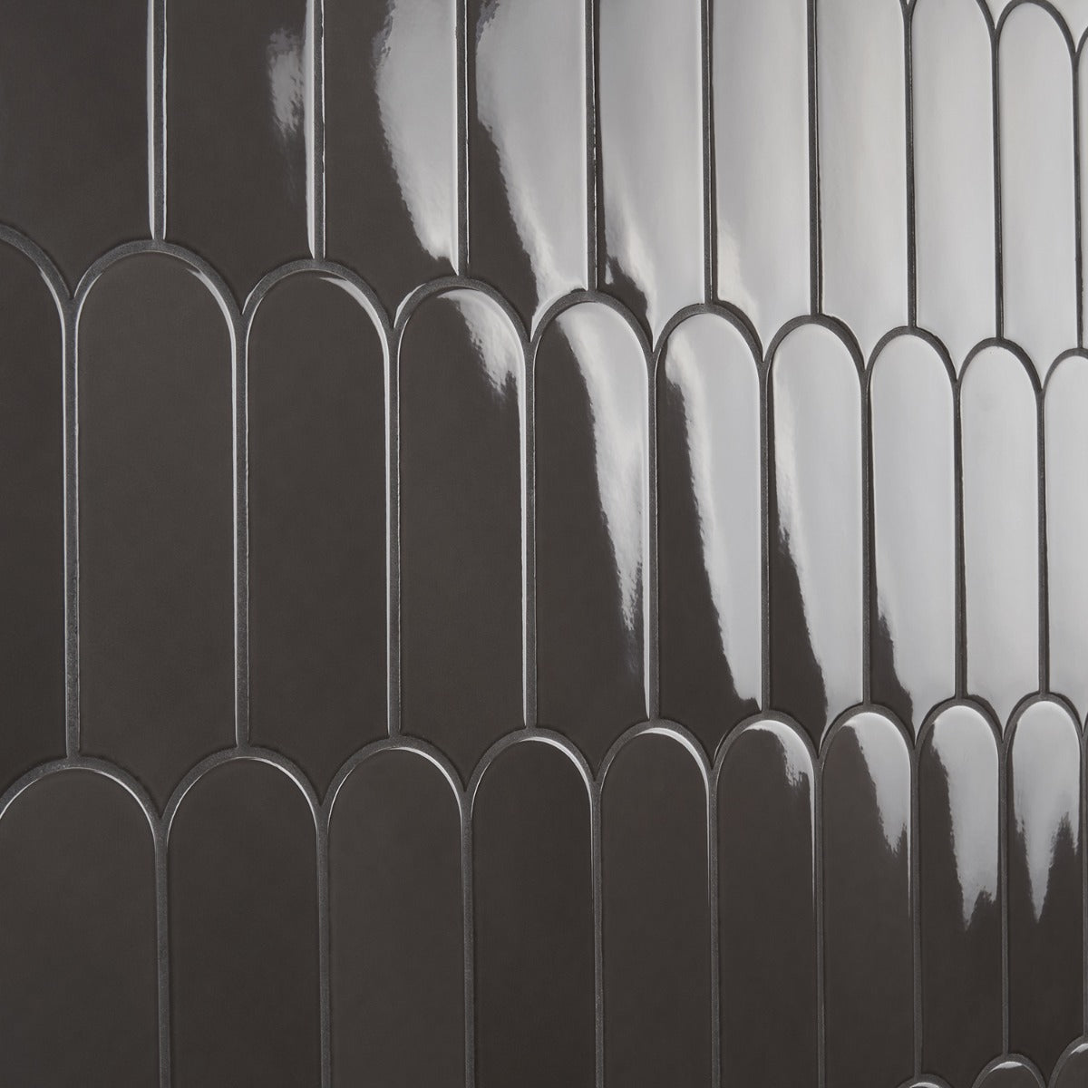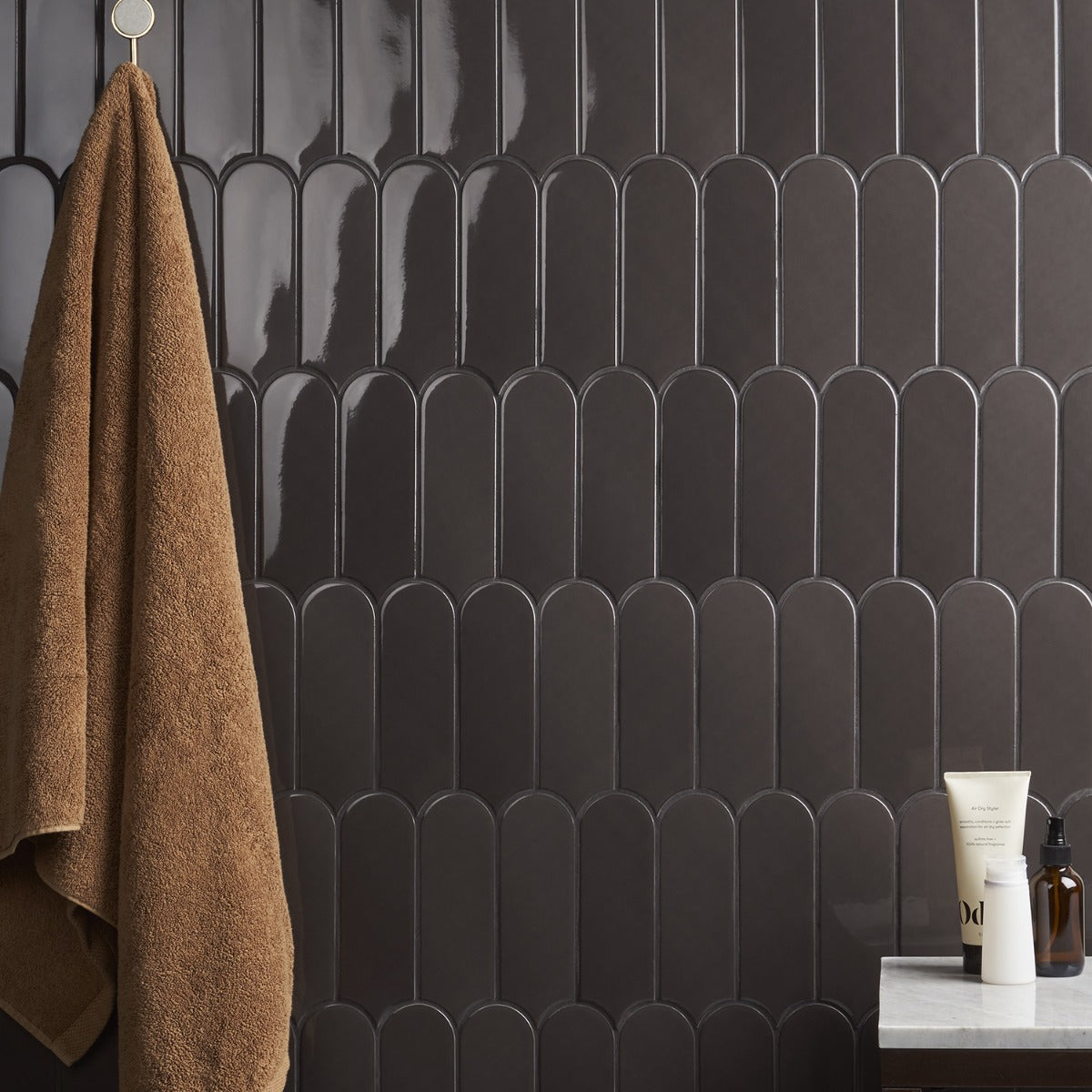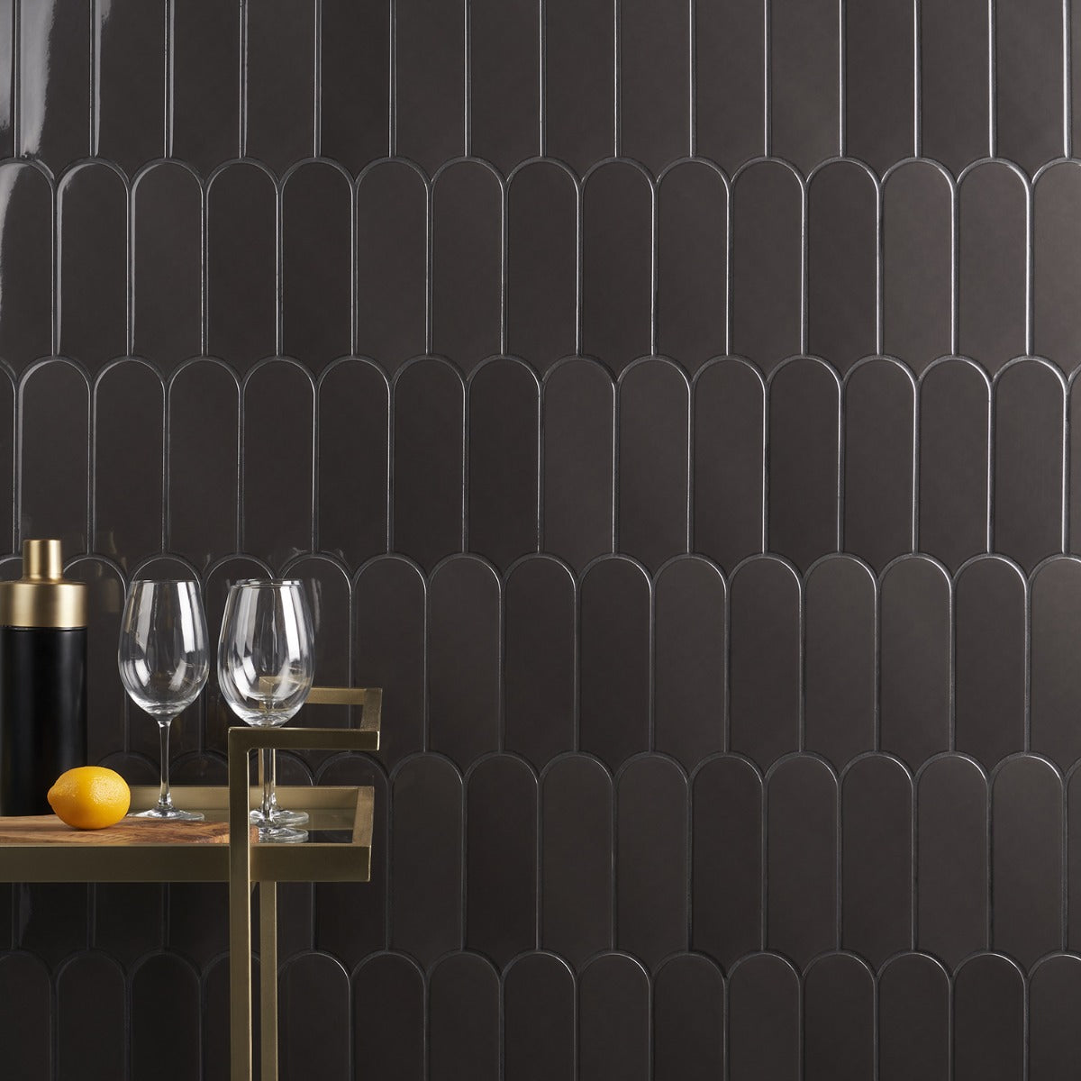 The Parry Charcoal Fishscale Glossy Ceramic Tile offers a unique and elegant design inspired by Art Deco. Its glossy finish and elongated fishscale shape make it perfect for backsplashes, feature walls, and bathrooms.