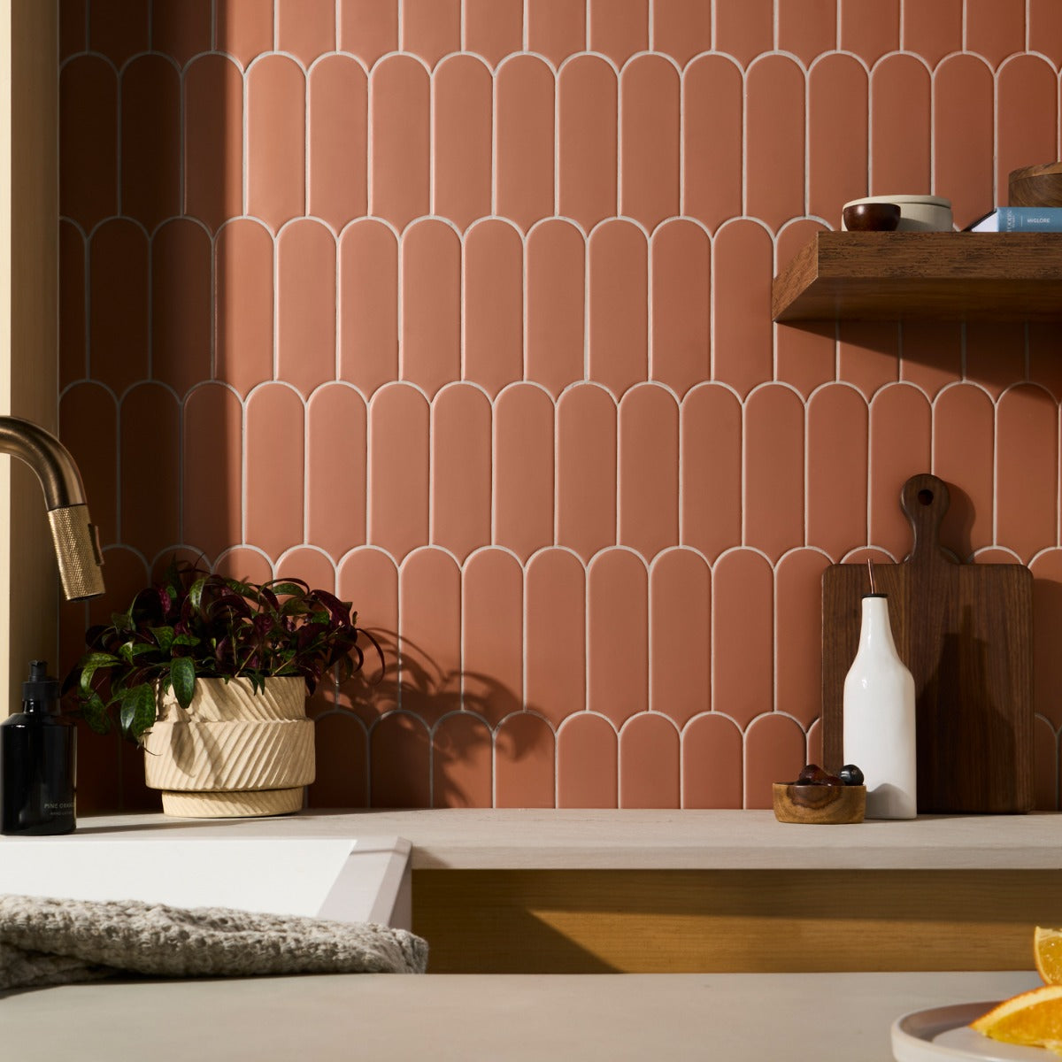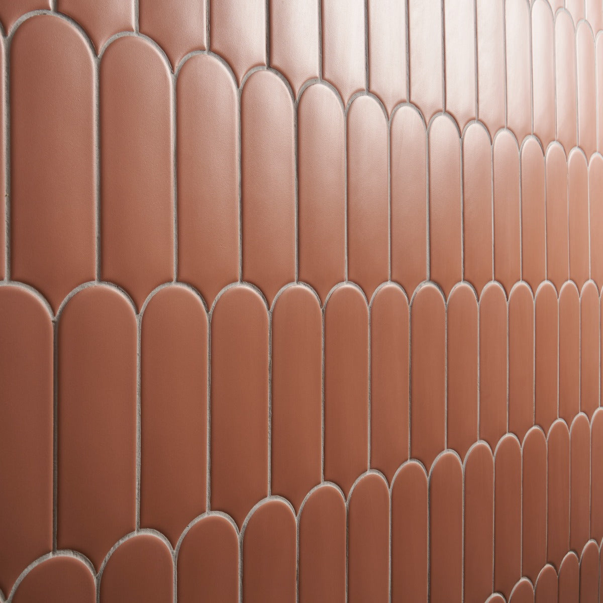 The Parry Clay Terracotta Fishscale Ceramic Tile features a unique elongated fishscale design with a matte finish, perfect for creating stunning backsplashes, feature walls, and bathroom accents. Its Spanish craftsmanship and Art Deco inspiration make it a versatile and stylish choice for any interior.