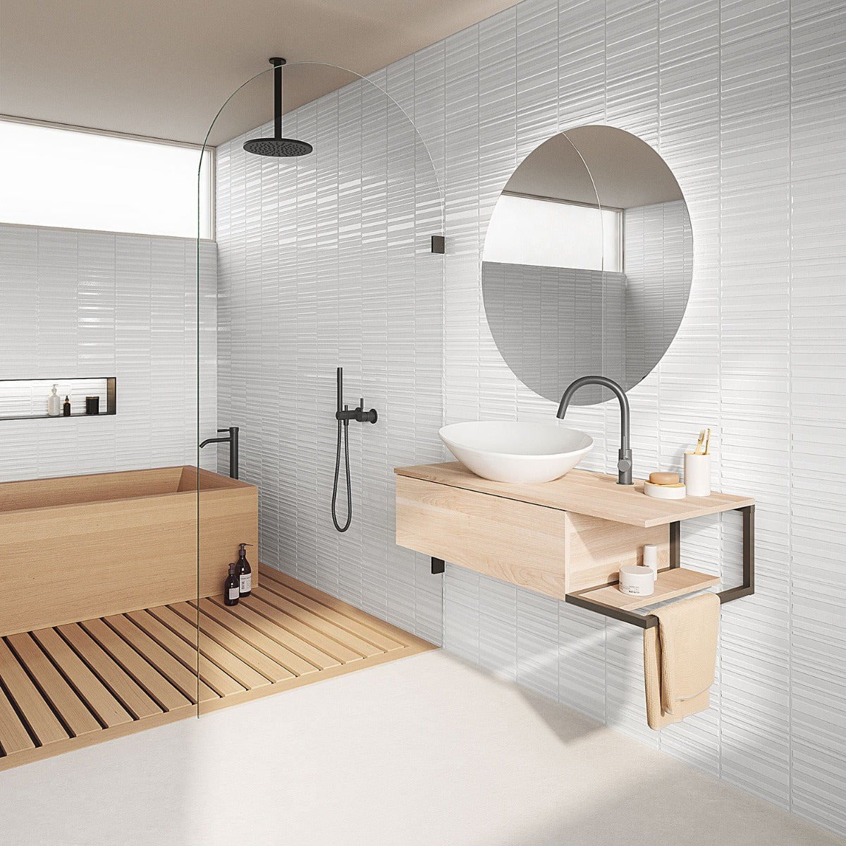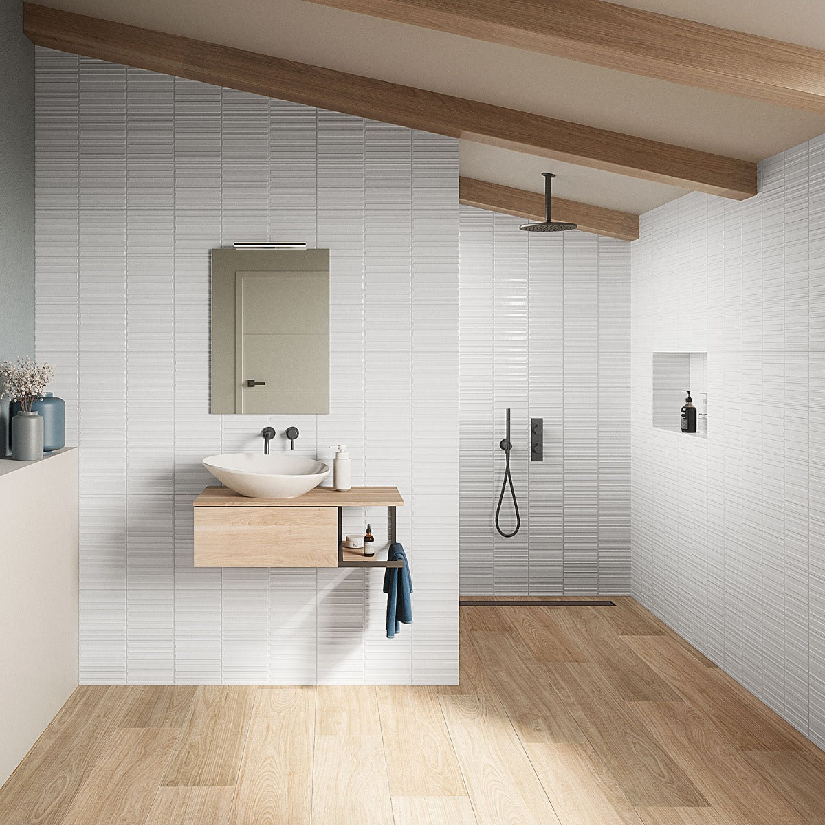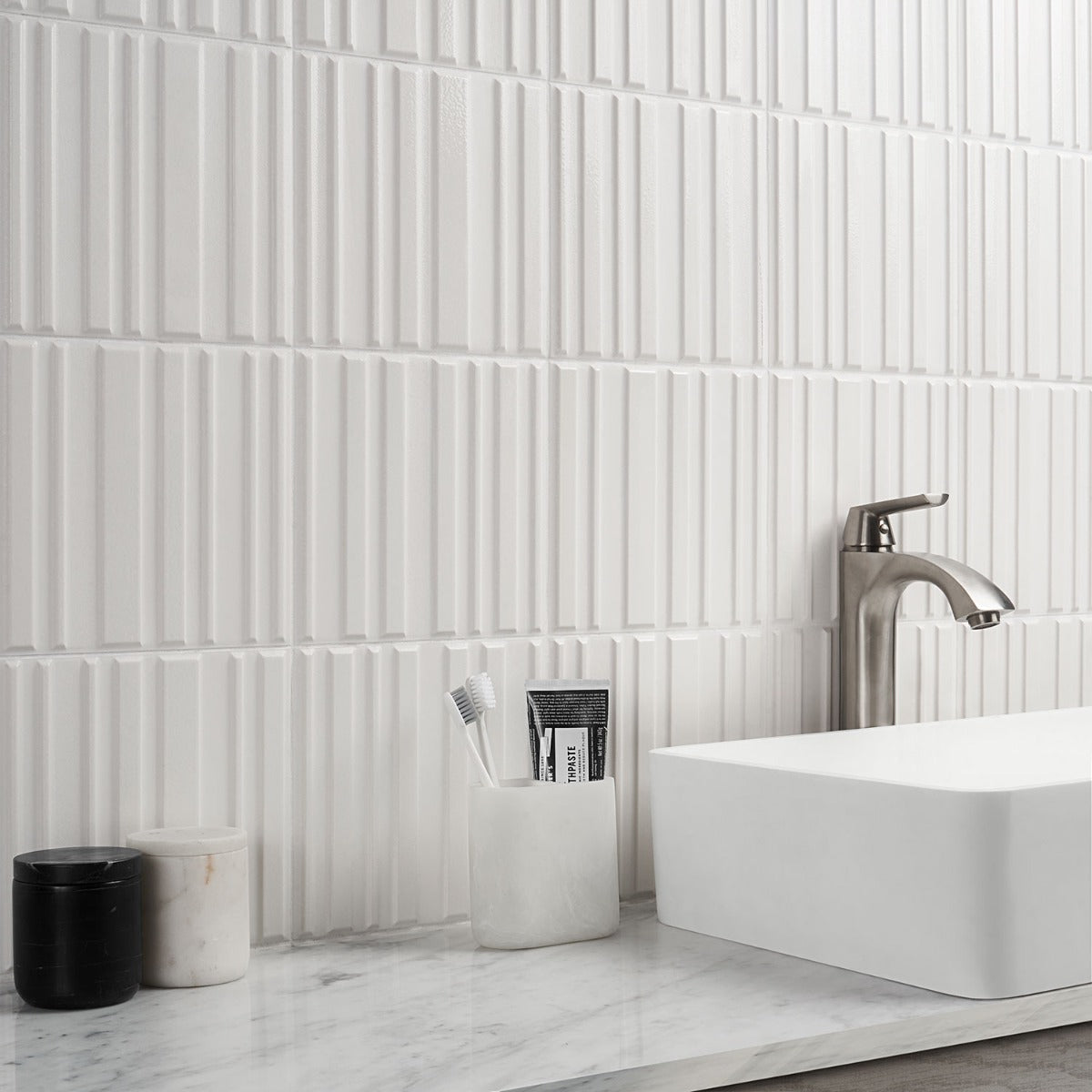The Sydney White 8x16 3D Ceramic Tile features a mixed glossy and matte finish, creating a dimensional and sophisticated look. Designed by architect Fran Silvestre, this tile is perfect for adding a modern touch to residential and commercial spaces.