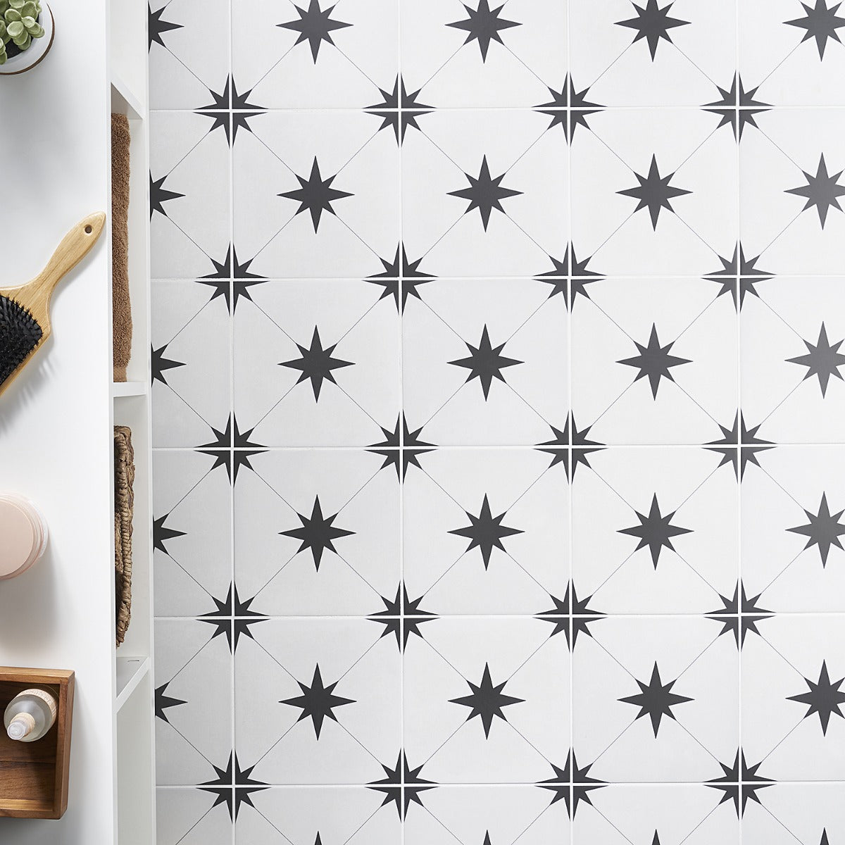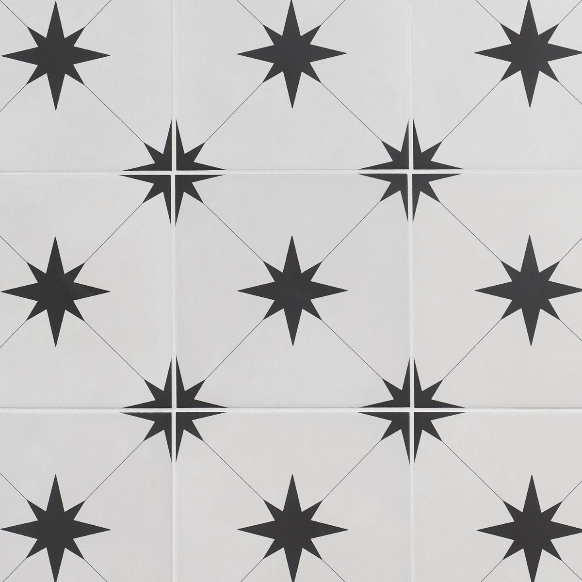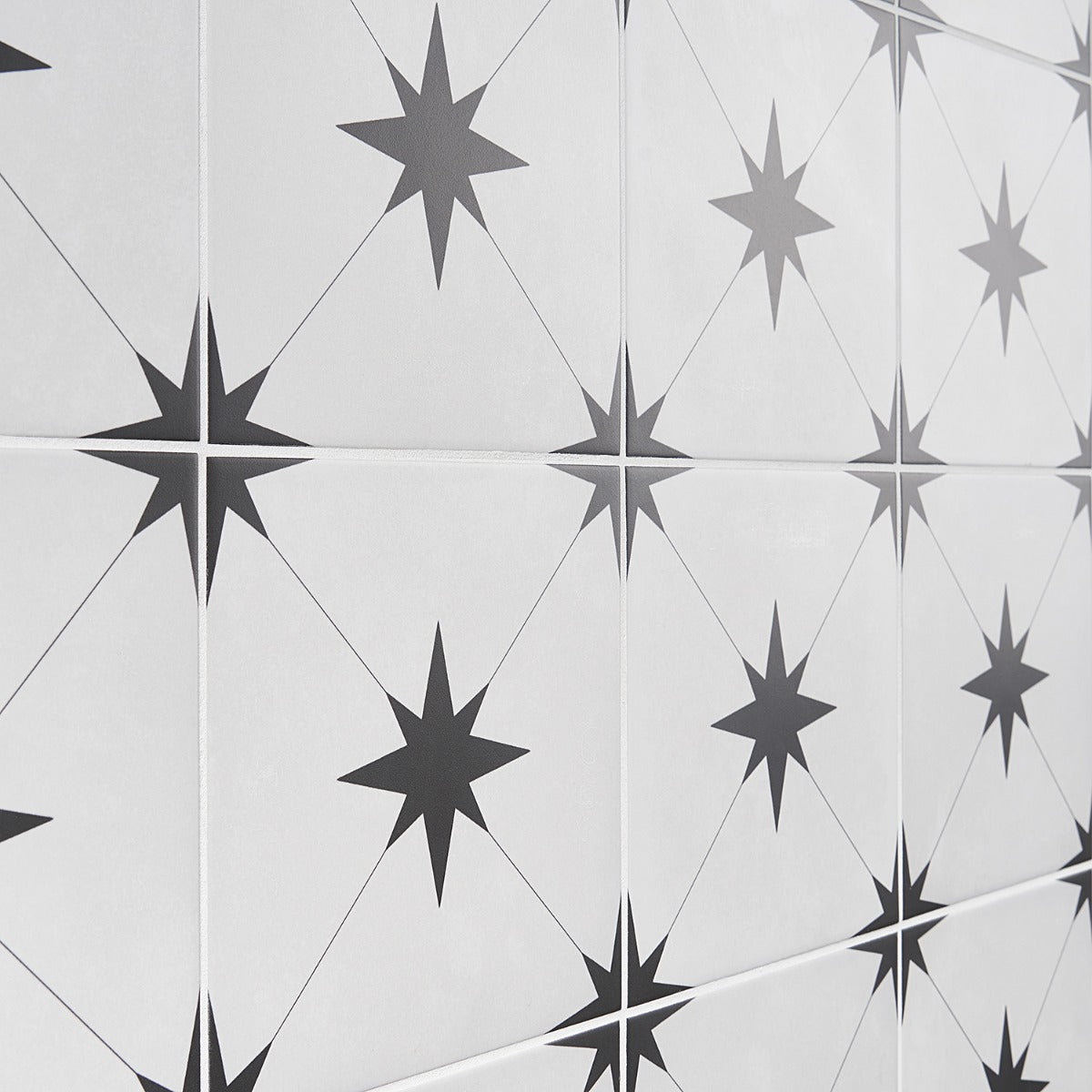 • Mediterranean Charm: Features a black star pattern on a white background, inspired by traditional encaustic tiles.