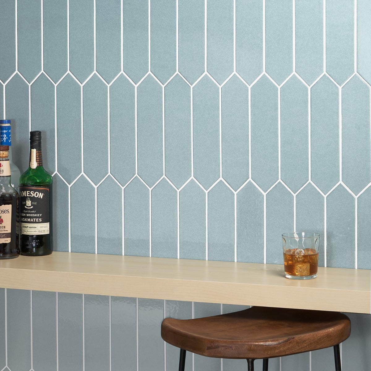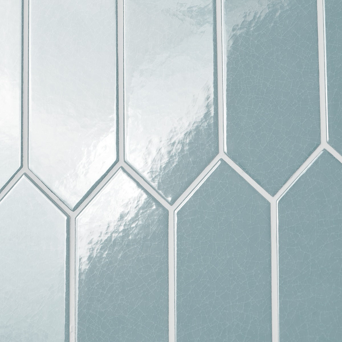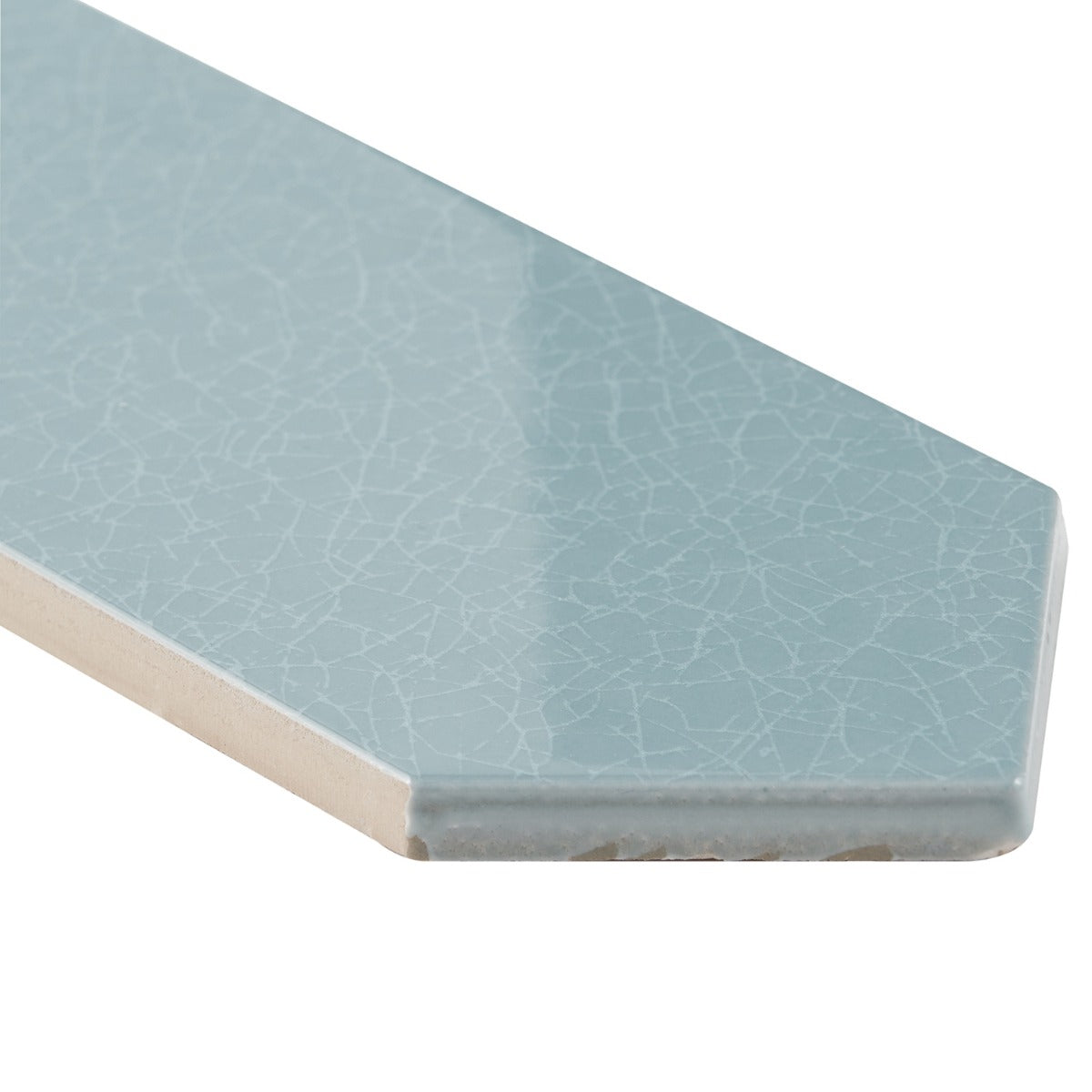 The Tehama Crackled Blue Ceramic Tile features a unique picket shape and a crackled glass finish, offering a vintage-inspired look with a modern twist. Perfect for backsplashes or feature walls, it adds depth and dimension to any space.