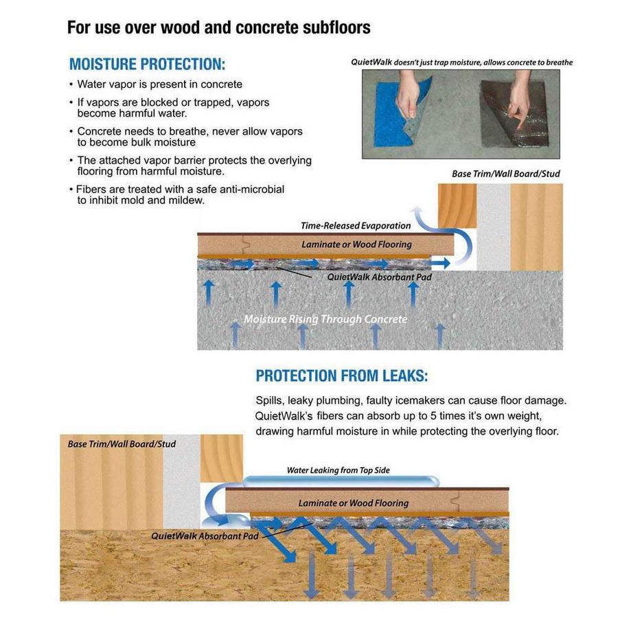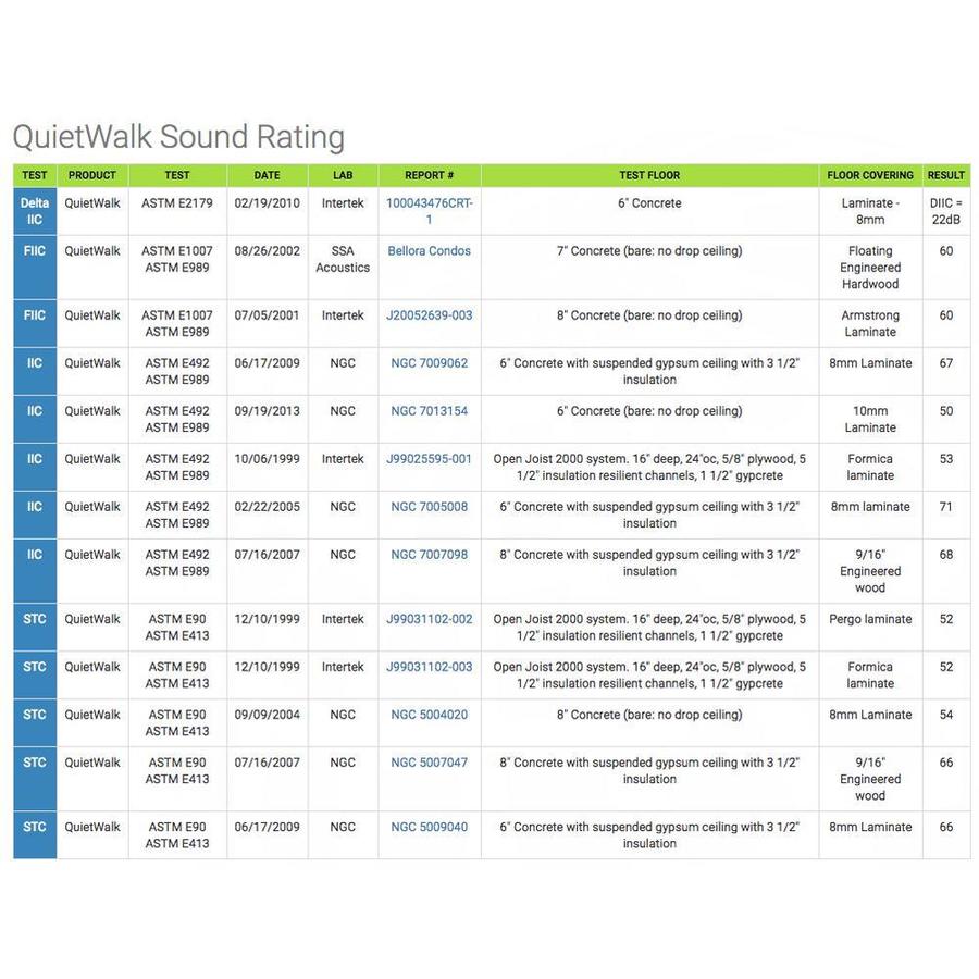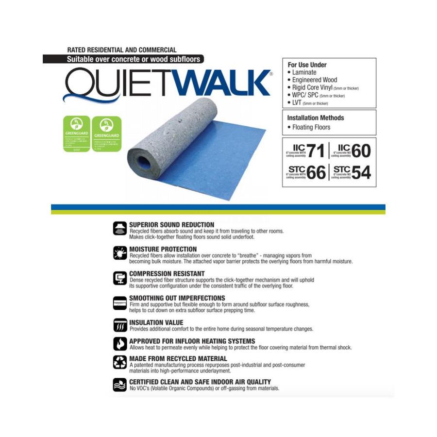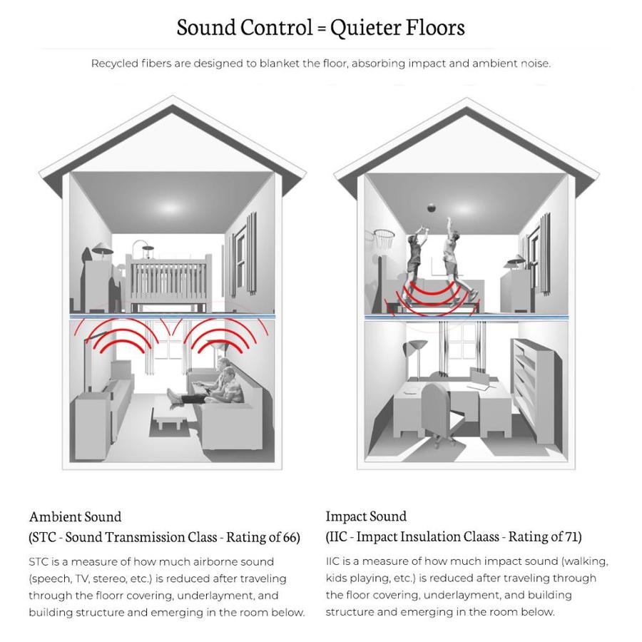 Underlayment with superior absorption and moisture control Treated with anti-microbial to inhibit mold and mildew growth No volatile organic compounds allowing your family to breath clean air in your home Laminate floor underlayment used for floating floor installations Greenguard Gold Certified - Meets health based criteria for additional chemicals and also requires lower total VOC emissions levels to ensure that products are acceptable for use in environments such as schools and healthcare facilities Use with laminate, floating engineered, floating bamboo and luxury vinyl plank (5mm and thicker) - underlayment is for floating floor applications (flooring that required no glue or nail down) - will not work with nail/staple or glue down applications Superior sound reduction recycled fibers absorbs sound and keep it from traveling to other rooms, makes click-together floating floors sound solid underfoot IIC (impact insulation class) sound rating of 71 - IIC is a measure of how much impact sound (walking, kids playing, etc.) is reduced after traveling through the floor covering, underlayment, and building structure and emerging in the room below STC (sound transmission class) sound rating of 66 - STC is a measure of how much airborne sound (speech, TV, stereo, etc.) is reduced after traveling through the floor covering, underlayment, and building structure and emerging in the room below
