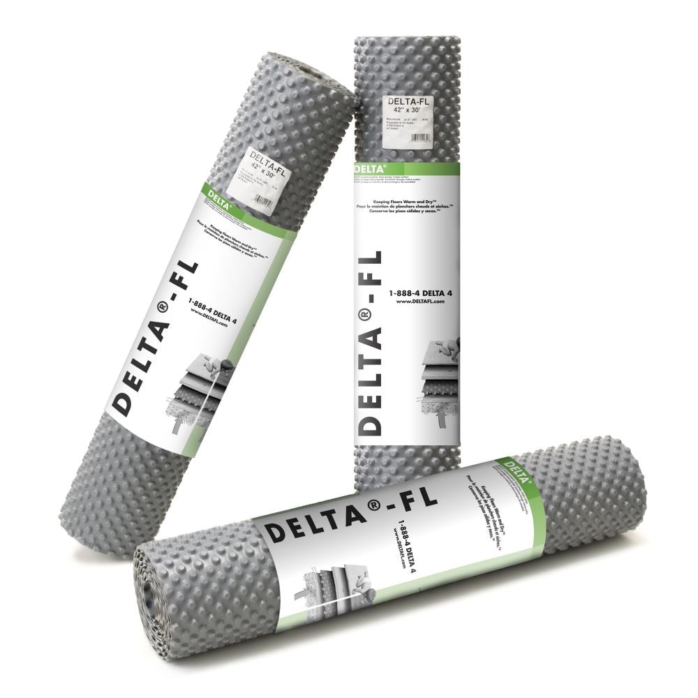 Dimpled DELTA-FL underlayment creates a sealed vapor barrier and thermal break over concrete and slab-on-grade floors, helping basements feel warmer and drier. The polypropylene roll installs quickly and supports laminate, hardwood, and luxury vinyl floating floors.