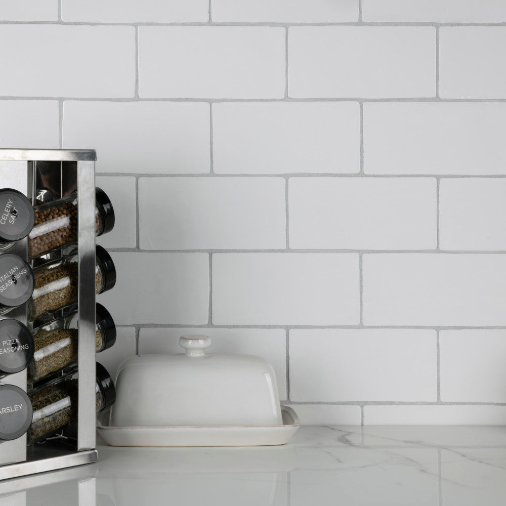 Classic 3x6 subway tiles in a matte Bianco finish bring a clean, handcrafted look to kitchens, baths, and accent walls. Durable glazed ceramic with subtle irregular edges adds texture and timeless style, sold by the case for cohesive wall installations.