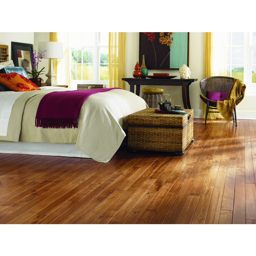 Beautiful grain pattern with dramatic color variations and exceptional hardness ideal for high-traffic areas Features longer than average lengths - up to 78-in Each plank features a beveled edge and beveled end Made with tongue and groove construction which allows for a nail down or staple down installation Each plank is hand scraped to provide a timeless look and extended durability for those families with active lifestyles Manufactured in the USA and backed by a 25-year limited residential finish warranty FloorScore certified to promote healthier indoor air quality for your family Virtually maintenance free - Bona hardwood floor cleaner and mop kit includes the only tools needed to maintain and care for your new hardwood flooring Don't forget to purchase the coordinating moldings