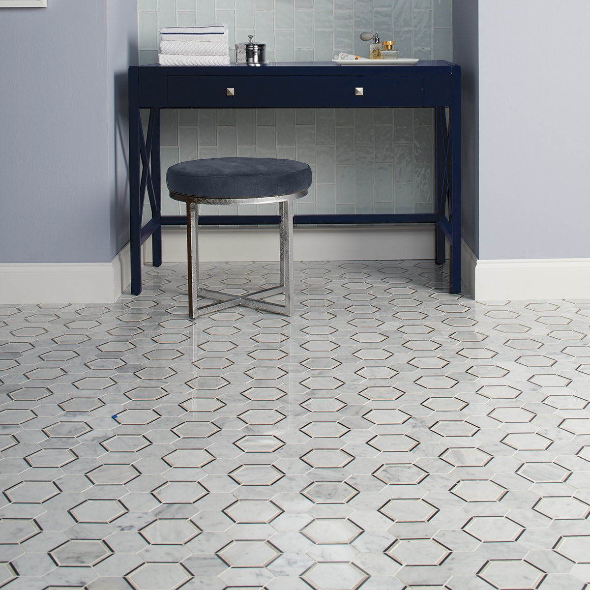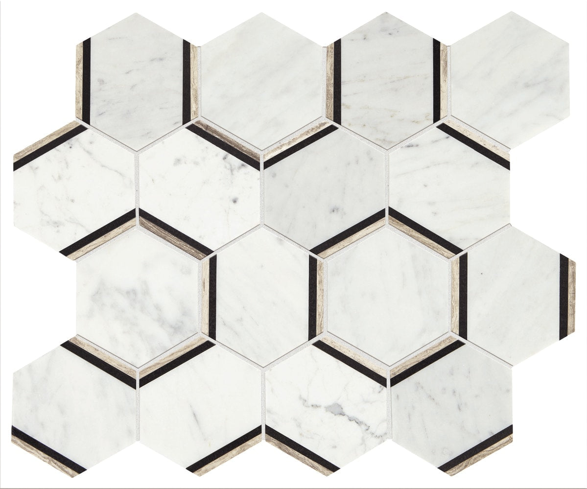 This mosaic brings the timeless allure of Carrara into a graphic honeycomb rhythm—sleek, polished, and irresistibly modern. The hexagonal geometry creates a dynamic field that catches the light and elevates everyday spaces. Style it across a bathroom floor with soft grey walls and brushed nickel accents for a refined, gallery-like feel. It’s a sophisticated essential that sets the tone for luxurious living.