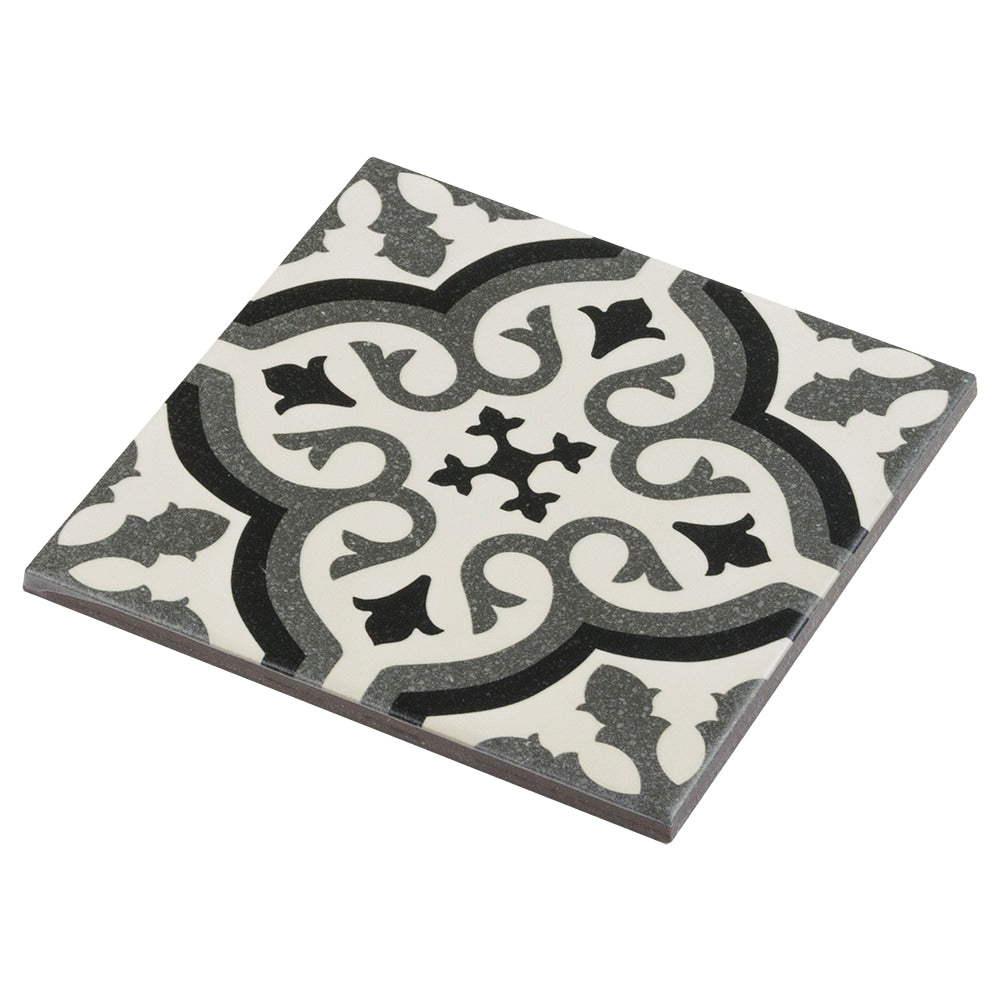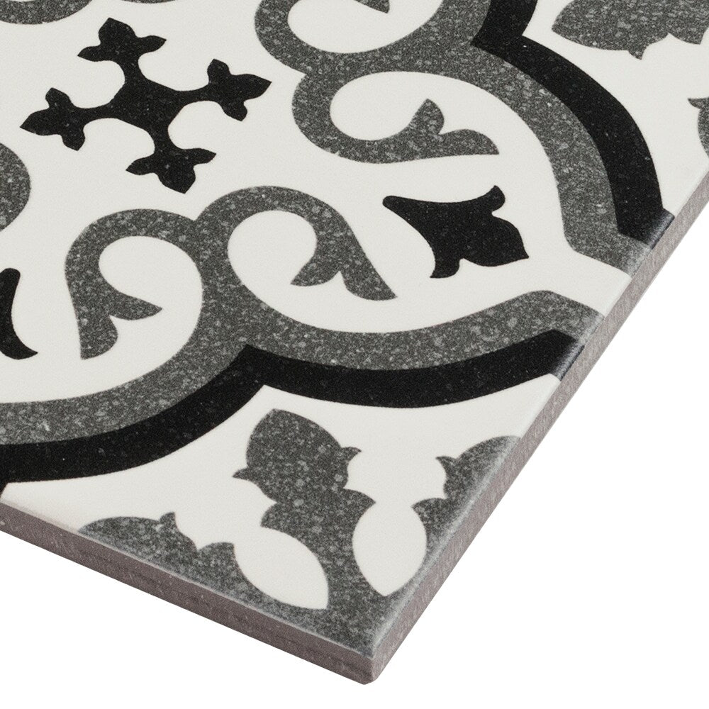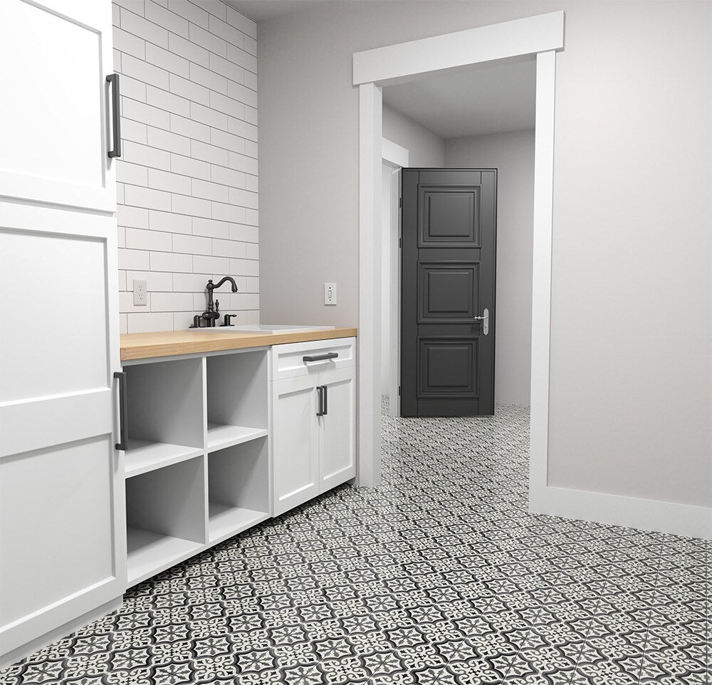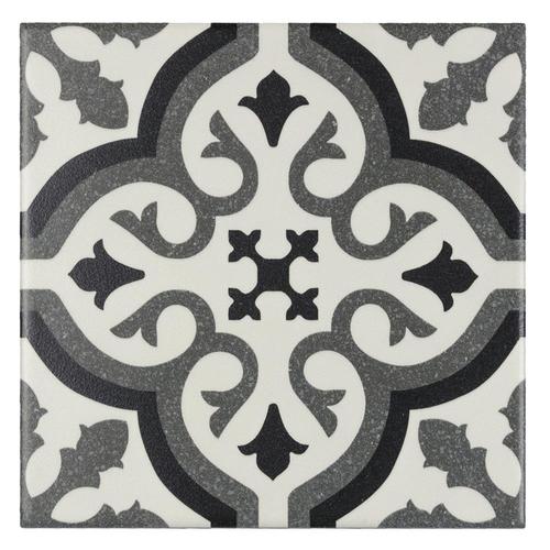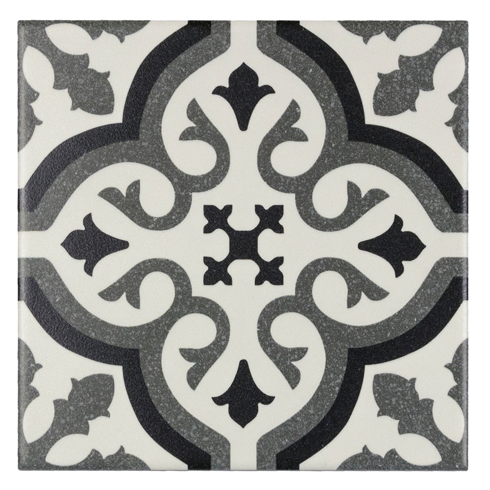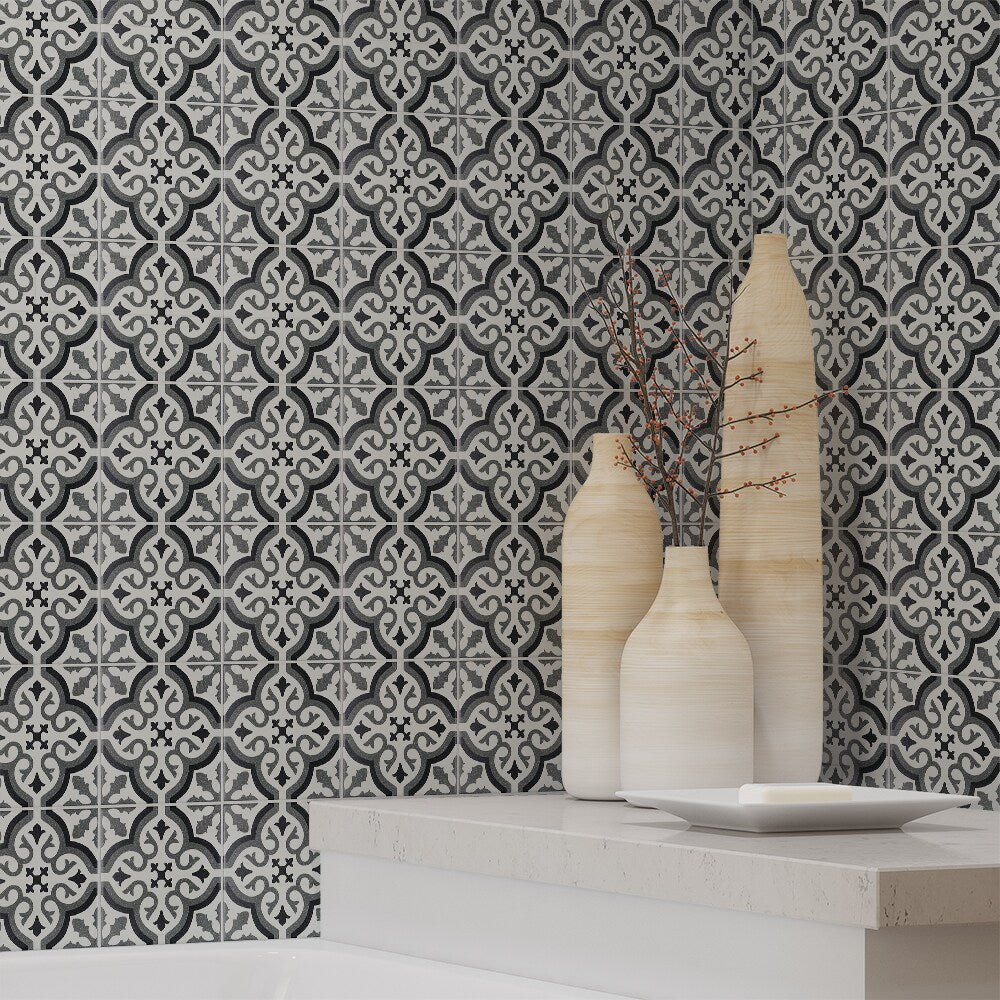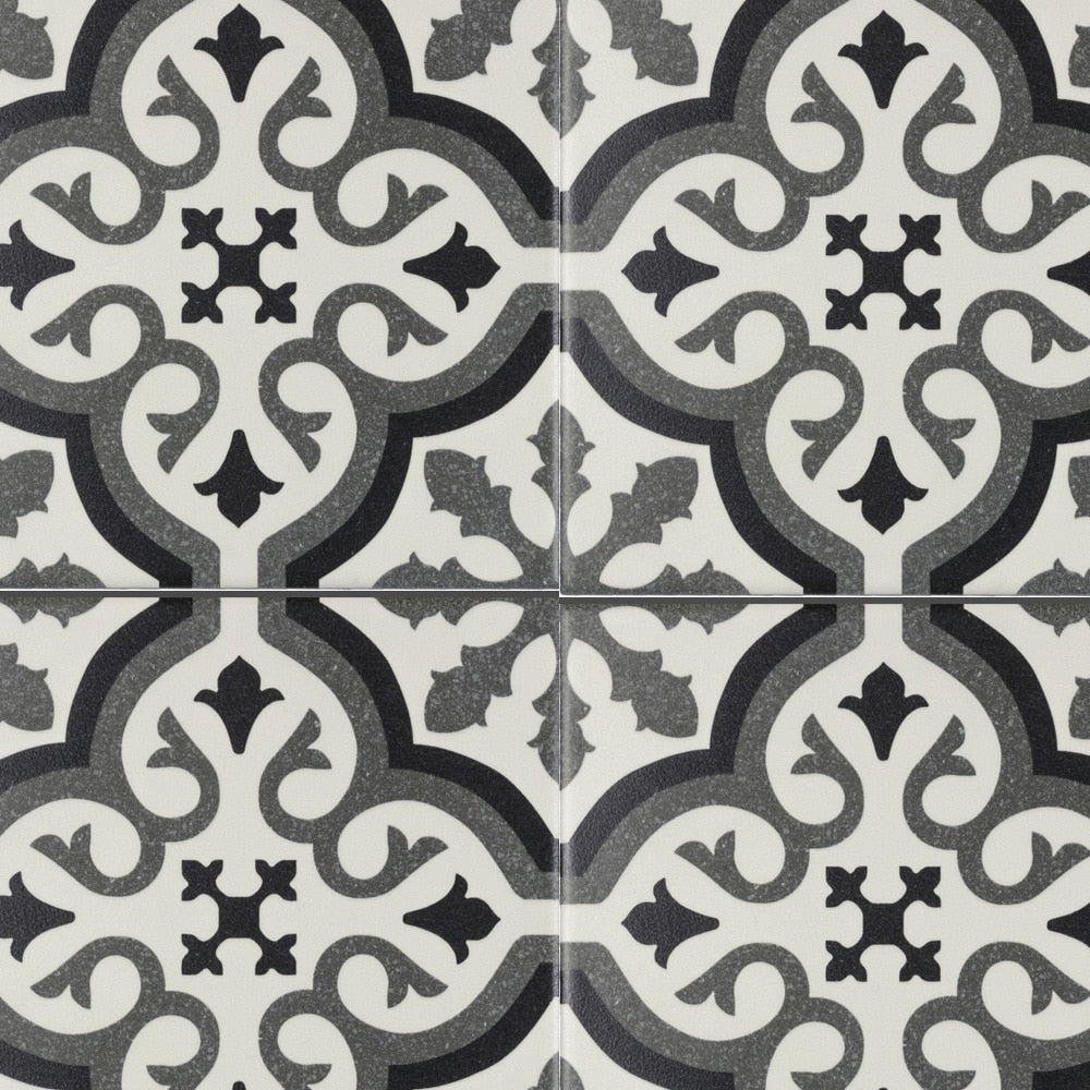 A durable porcelain tile with a matte encaustic-look pattern in black, white, and gray. Rated for heavy traffic and impervious to water, it’s ideal for floors and walls in bathrooms, kitchens, showers, and outdoor spaces.