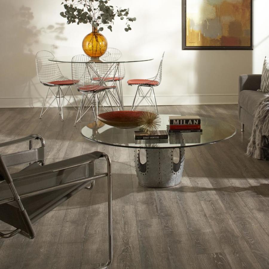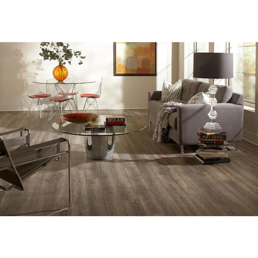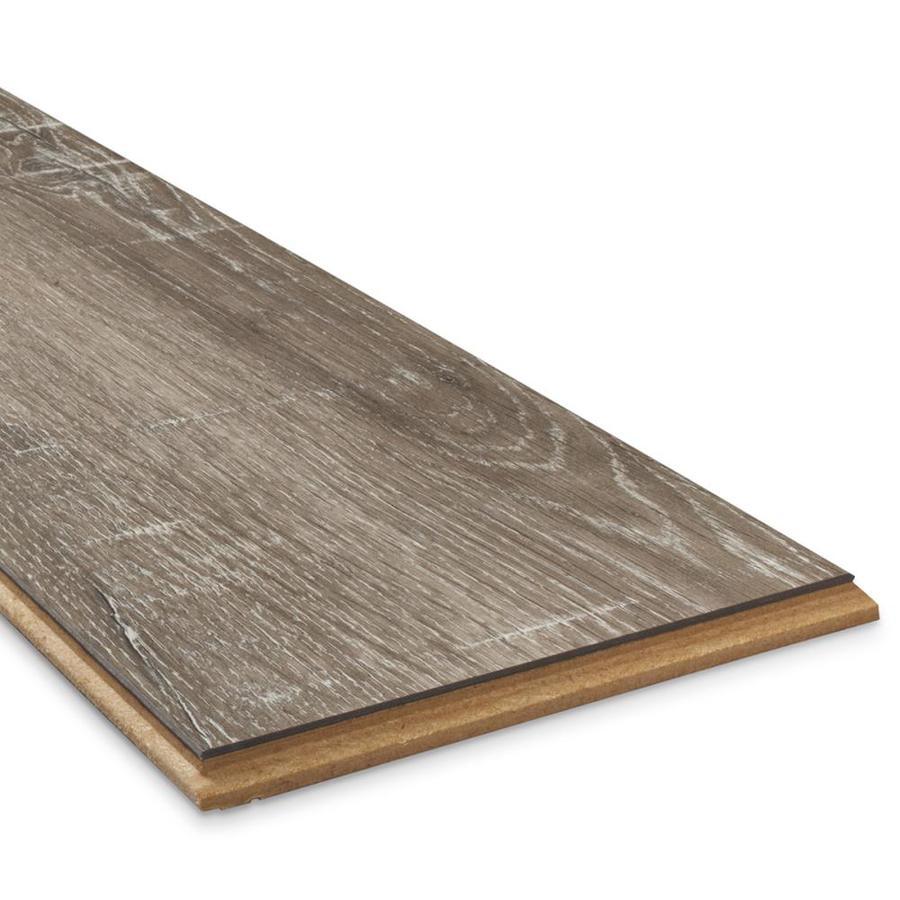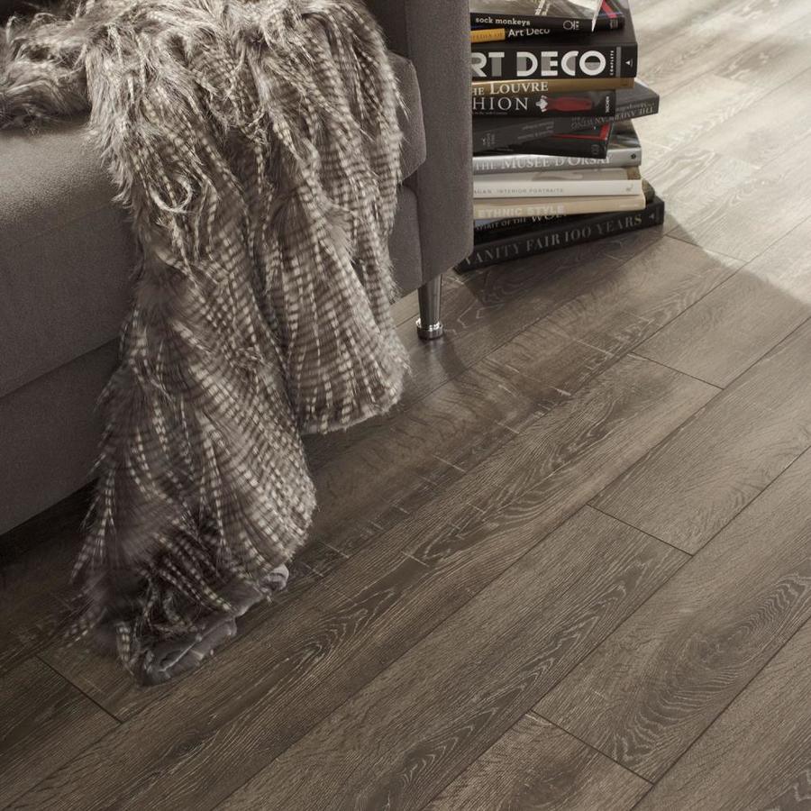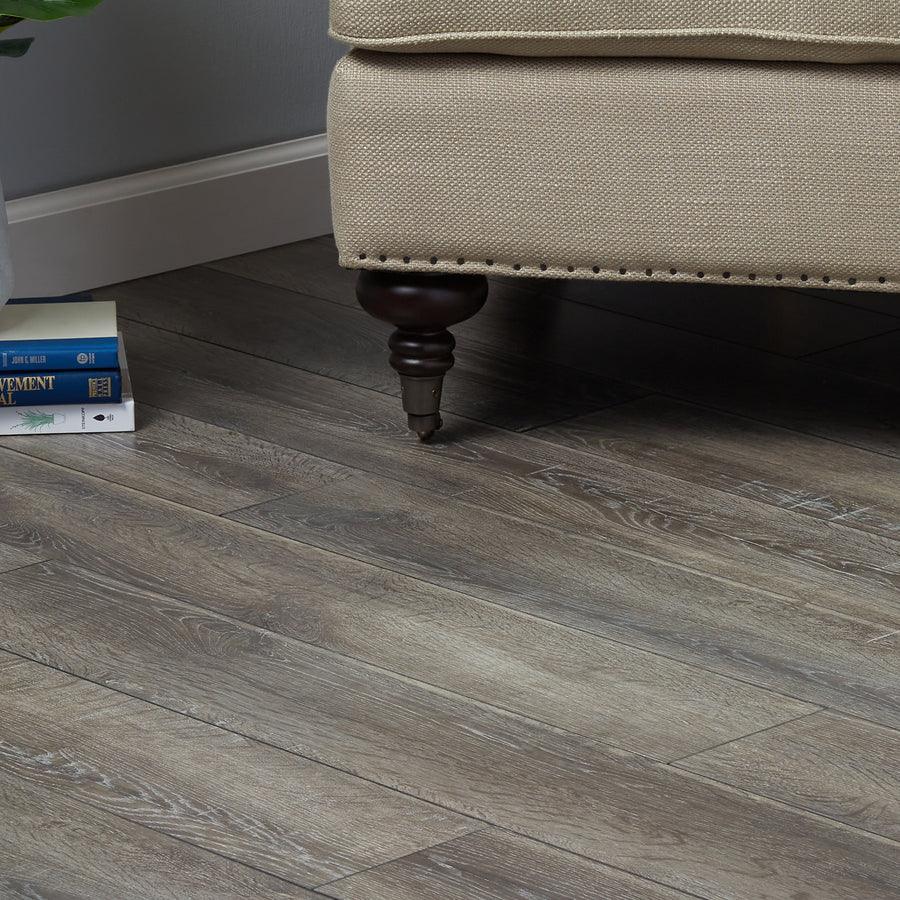 The warm grey tone and intricate graining on this six-inch beveled plank adds a cozy feel to any room To make your room appear larger, install planks parallel to the longest wall 30-Year Limited Warranty with AC3 wear layer that provides tough scratch and scuff resistance 8mm thickness Easy to install locking system requires no glue and makes installing a laminate floor an easy DIY project - coordinated mouldings available Underlayment is required and we recommend Pergo Gold for easier installation and industry leading sound, thermal and moisture protection CARB Phase 2 Compliant Manufactured in the USA with materials from USA and Europe