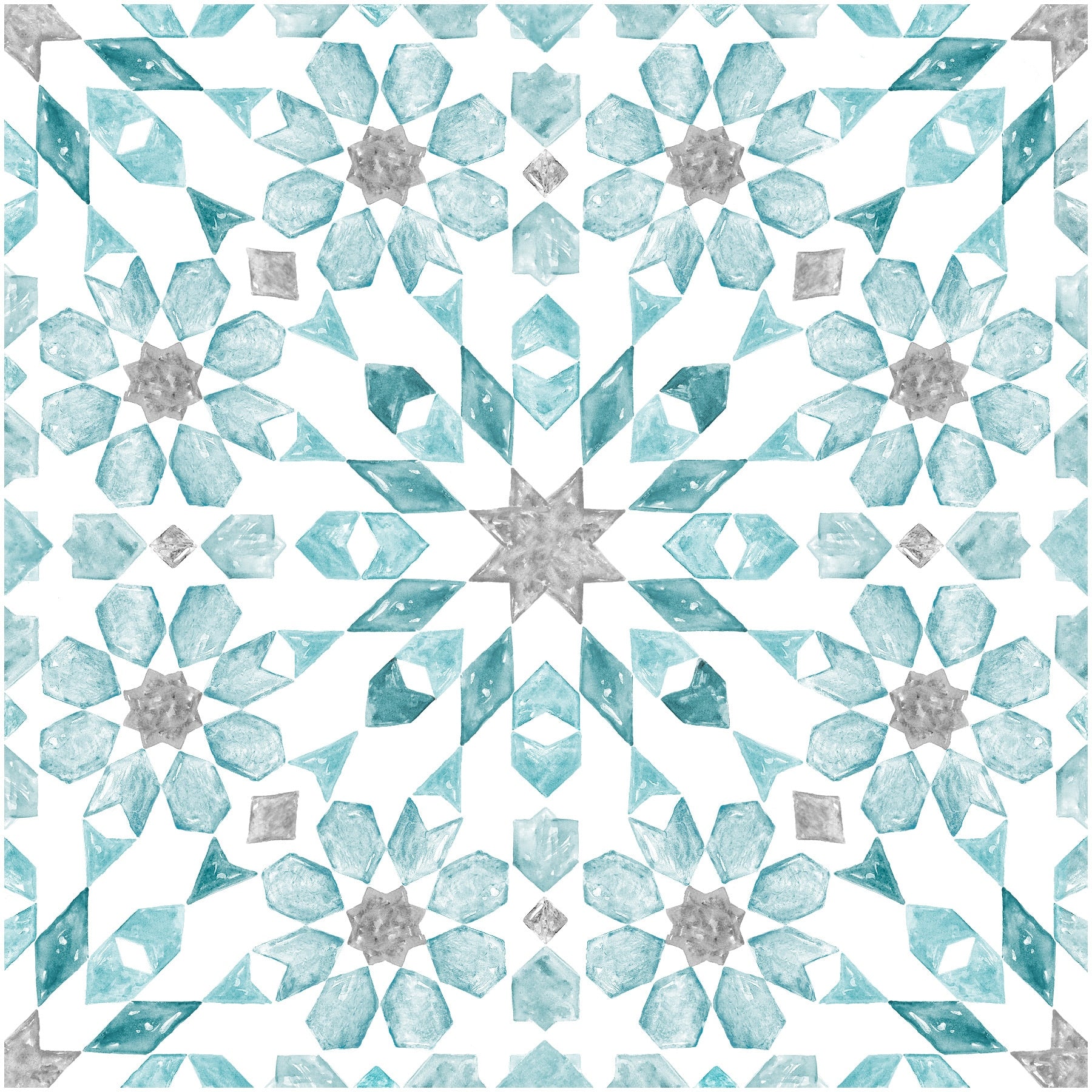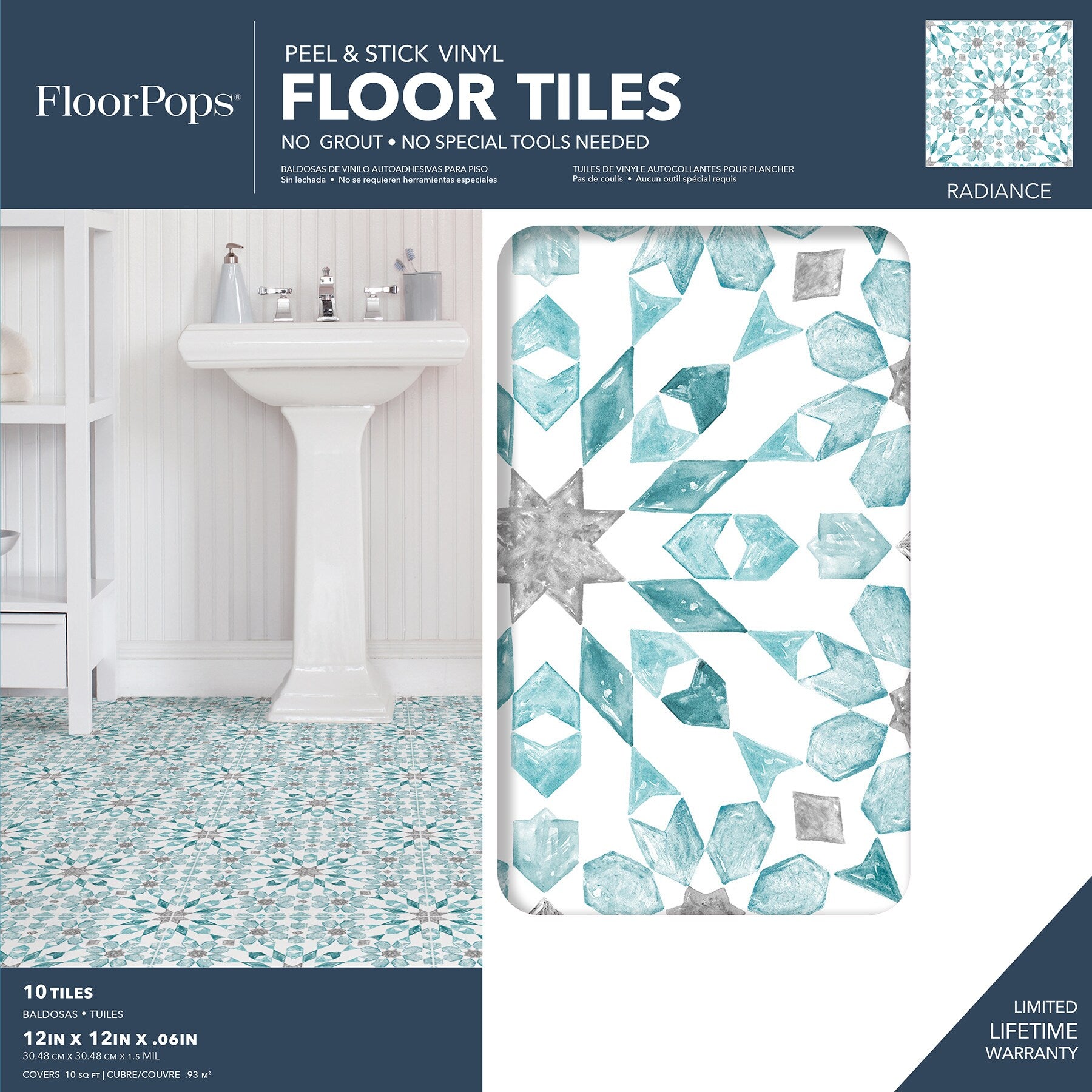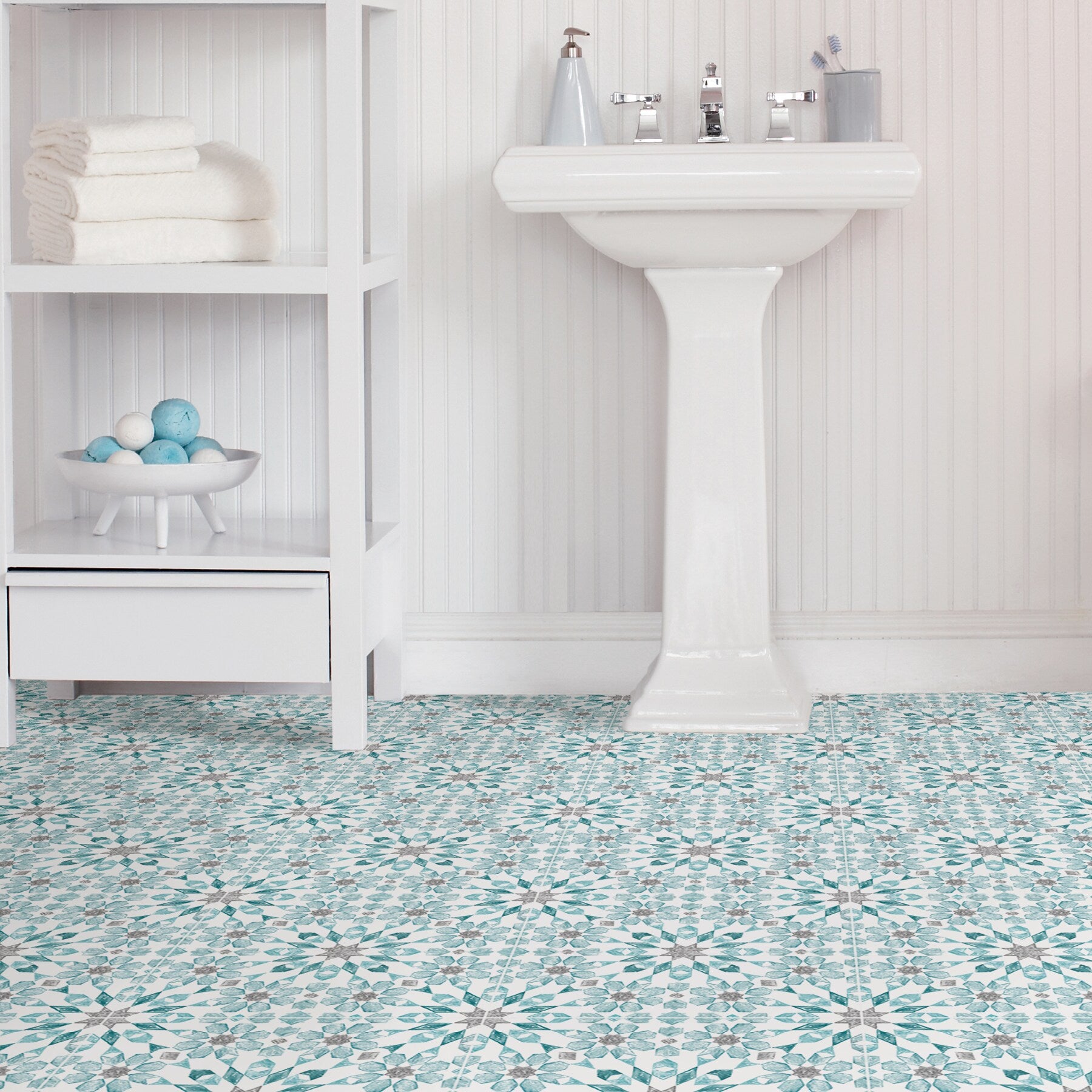 Refresh floors with these water-resistant peel-and-stick vinyl tiles featuring an aqua and gray hand-painted look. Each 12-in x 12-in tile installs without grout or special tools and uses a durable virgin vinyl construction with a low-luster texture. Ideal for quick indoor updates across kitchens, bathrooms, and more.