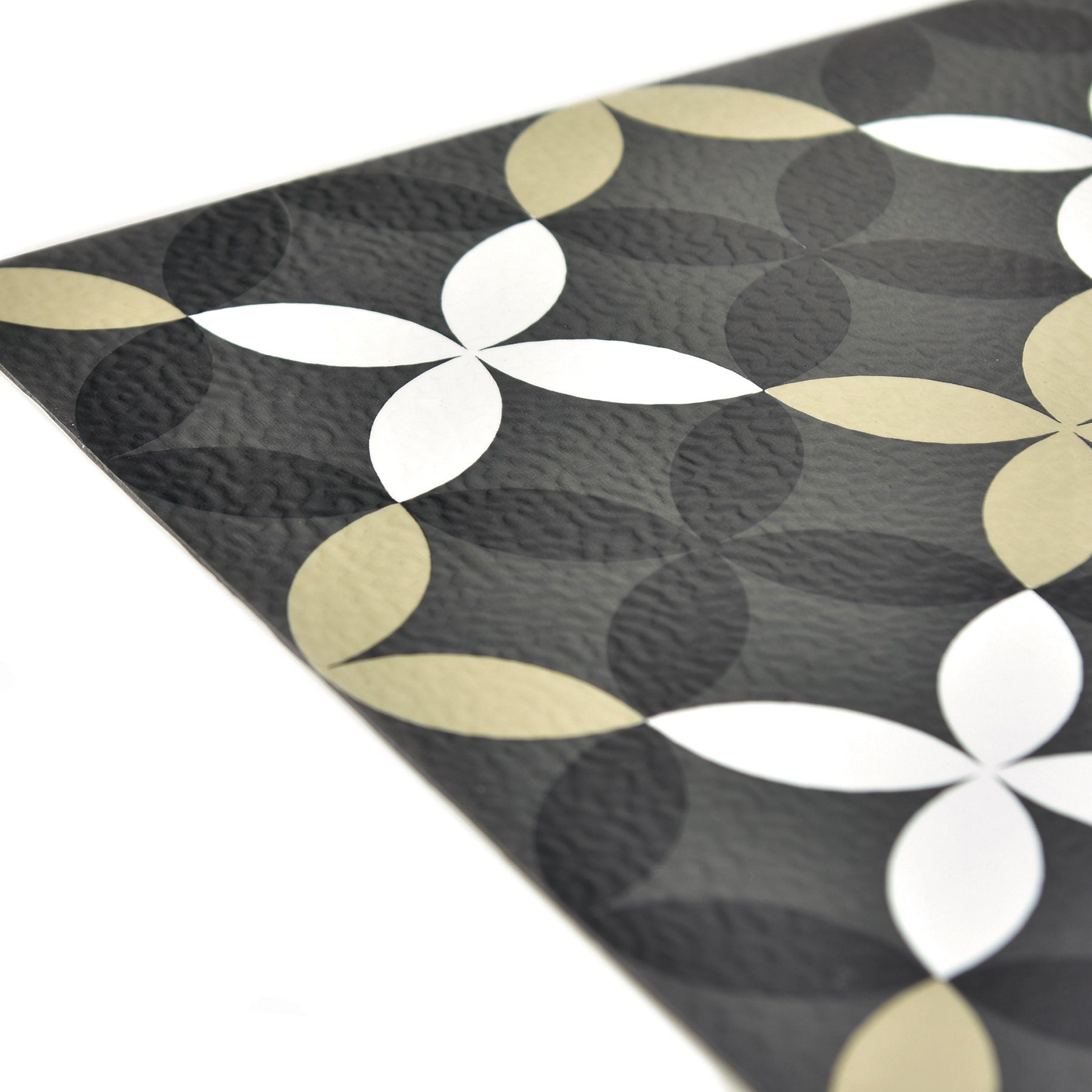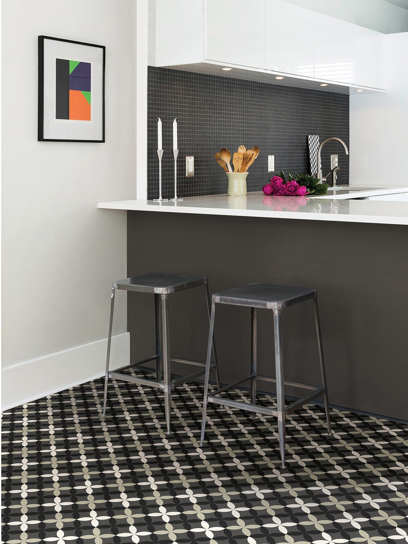 Retro-inspired geometric peel-and-stick vinyl tiles bring a patterned look to kitchens, baths, and rentals. Each 12 x 12 tile is water resistant, washable, and backed with permanent adhesive for quick DIY installation without grout or special tools. Textured, low-lustre finish enhances durability for light-traffic residential spaces.