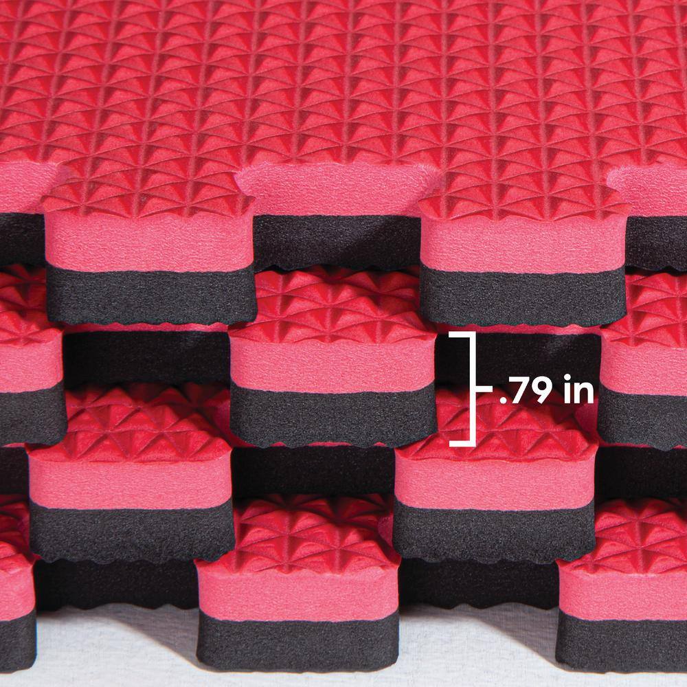 Duraflex by NORSK reversible interlocking foam tiles create cushioned, anti-slip flooring for home gyms, playrooms, and workshops. Each 24 in. x 24 in. tile is 0.79 in. thick with closed-cell construction for superior support and durability, and includes straight-edge trim pieces for finished borders. Easy to install and clean, the dual-sided red/black design lets you customize your look.