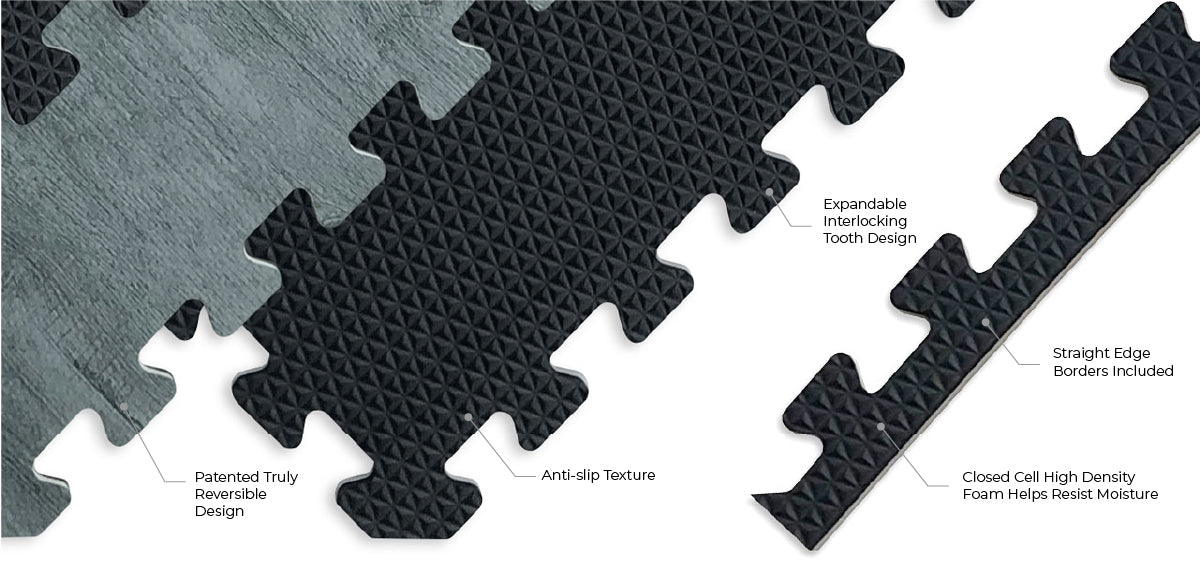 Duraflex by Norsk reversible interlocking foam mats feature realistic faux wood grain on one side and a textured black reverse for versatile style and comfort. Each 24 in x 24 in tile provides cushioned support, acoustic and thermal insulation, and installs as a floating floor with no adhesives. Ideal for home or business spaces needing quick, portable protection and easy cleaning.