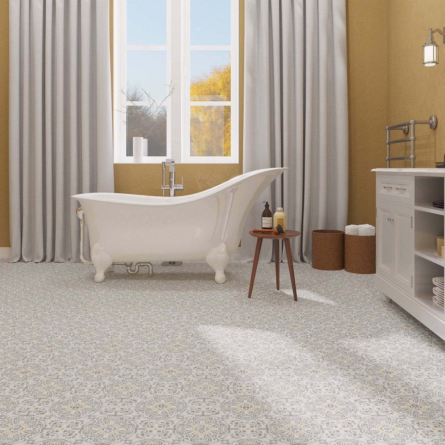 The Sicilian Grey motif breathes romance into a room—ornate, lace-like medallions that feel collected yet crisply contemporary. I love the soft grey and warm accents that dance across the surface, adding movement without overwhelming the space. Try it under a freestanding tub or in a galley kitchen to turn the floor into a statement rug. It’s a chic essential for everyday luxury underfoot.