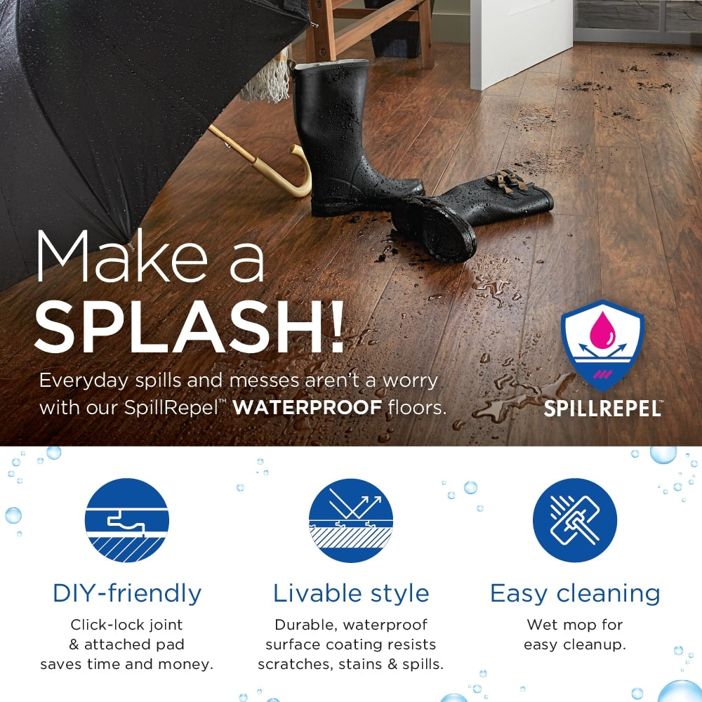 Handscraped laminate planks with SpillRepel waterproof protection deliver rich Toasted Chestnut style and everyday durability. A 12 mm total thickness (10 mm plank + 2 mm attached pad) and click-lock design make installation fast and stable across any level of the home.