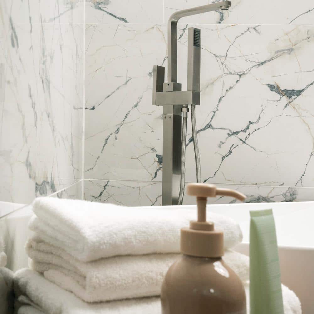 MSI’s Lockson Mix porcelain tile delivers a marble-look canvas of creamy white with dynamic gray veining in a large-format 24x48 size. The polished, rectified surface is durable, water-resistant, and ideal for floors, walls, and shower surrounds in residential or light commercial spaces.