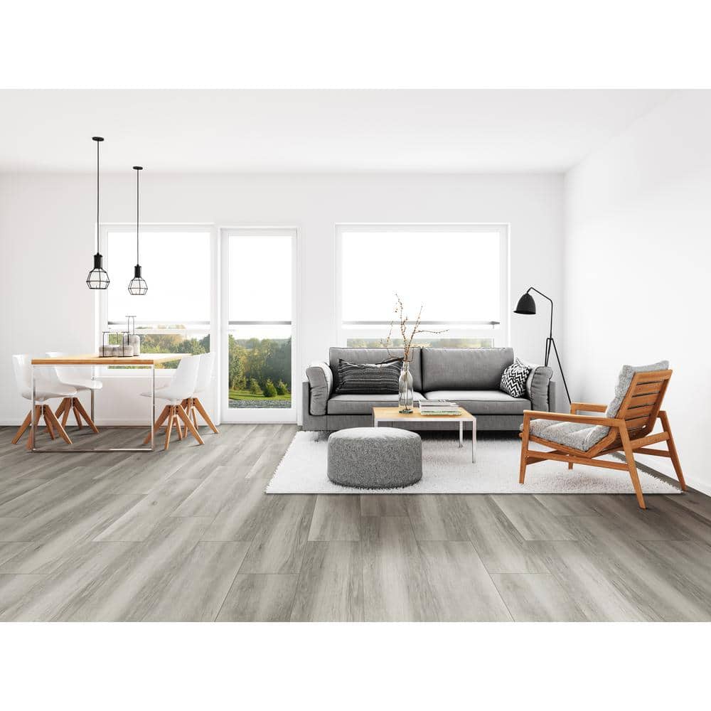 Ranier Taupe brings a hush of calm to a room—the quiet elegance of weathered wood translated into resilient porcelain. Its subtle taupe striations and soft matte finish ground the space with effortless sophistication. Run the planks in a long, continuous layout to elongate sightlines, then layer charcoal textiles and pale oak accents for contrast. It’s a modern essential for living beautifully—luxury that lives well.