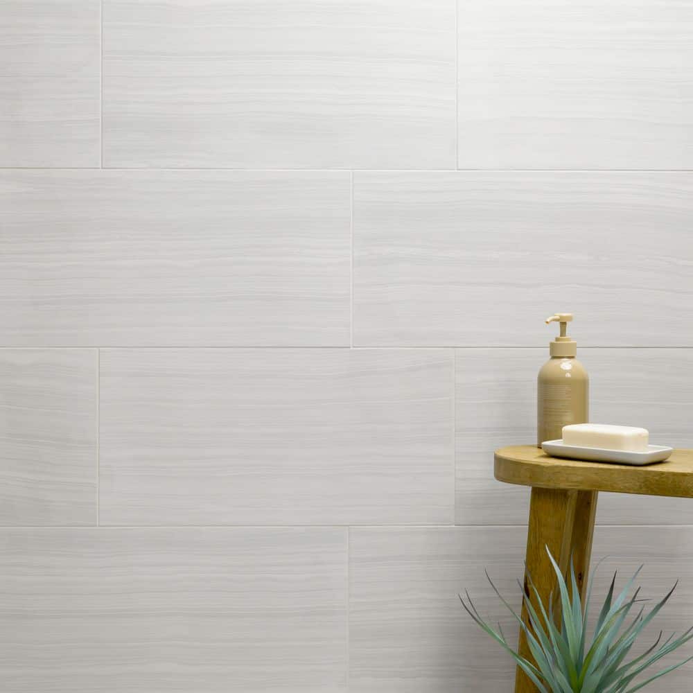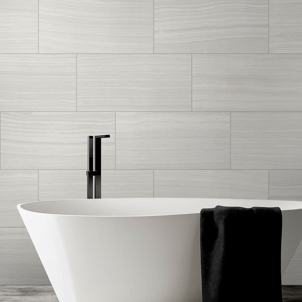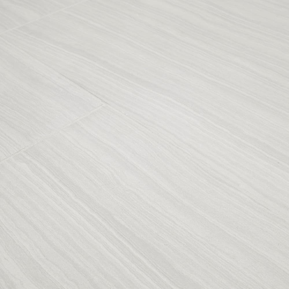 Stone-look porcelain tile with soft gray tones and linear veining in a matte finish. Designed for floors and walls, this durable, waterproof tile suits kitchens, bathrooms, showers, and more.