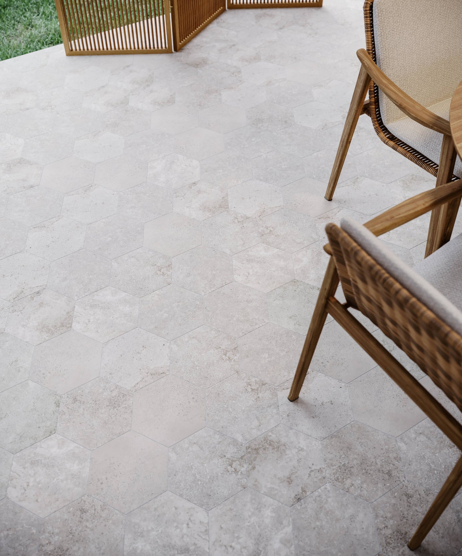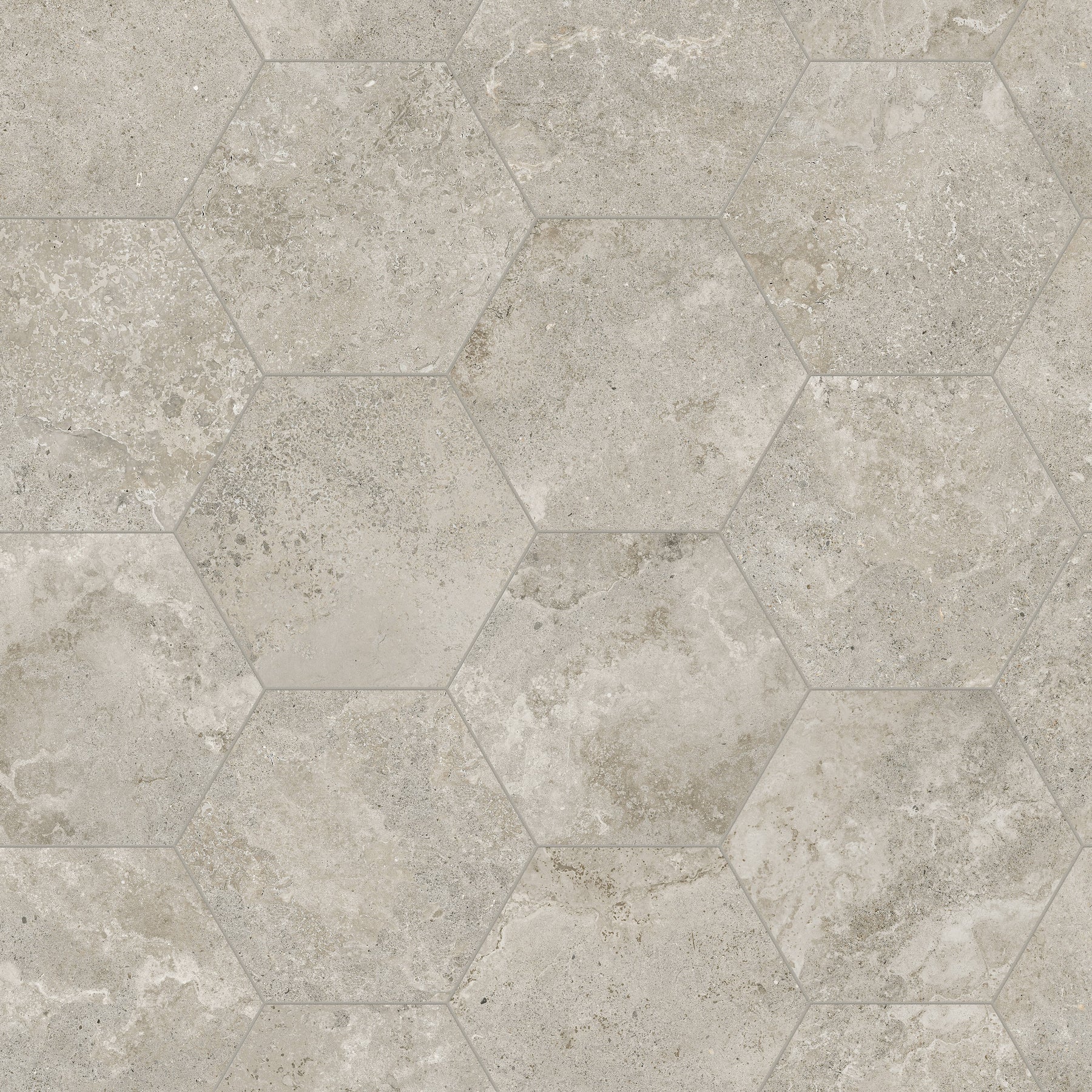 Elevate your interior spaces with the Satori Cosmo Argento Matte Porcelain Hexagon Tile, perfect for floors or walls. Its contemporary stone look and unique hexagonal design bring style and interest to any room, offering a durable, waterproof option for various applications including kitchens, bathrooms, and entryways.
