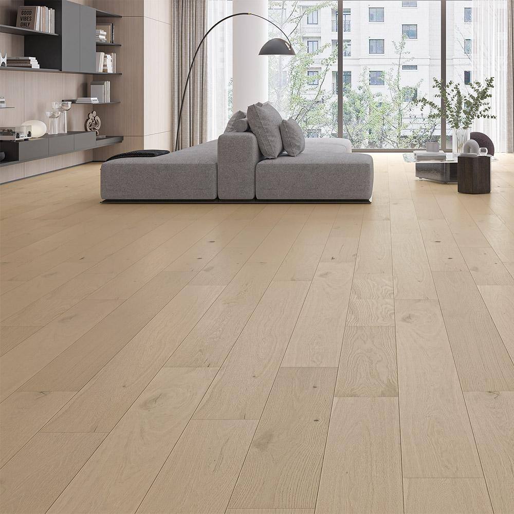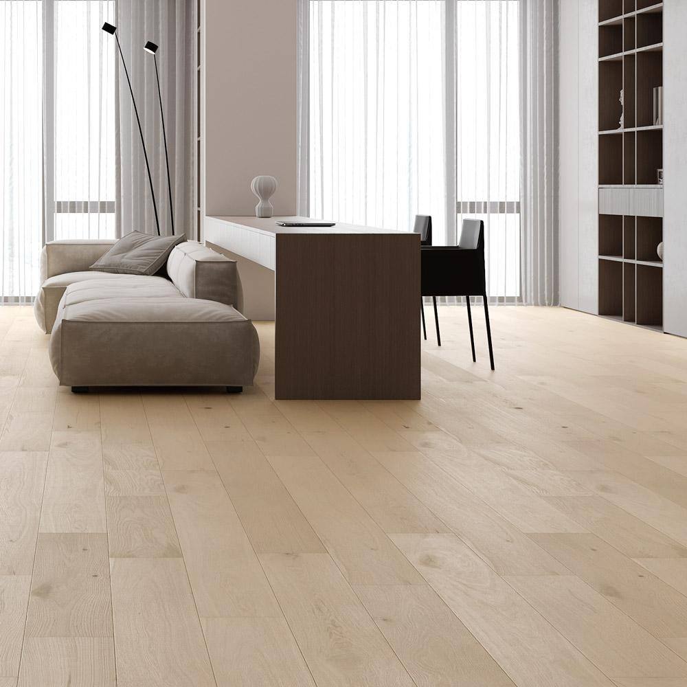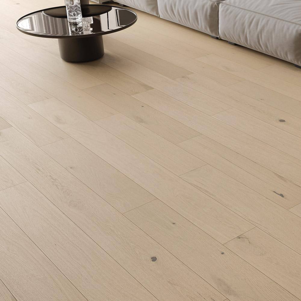 This captivating hard wood flooring invites elegance into every room, enriching your home with the distinguished allure of natural oak. Its wire-brushed, low-gloss finish boosts visual texture and exudes refined sophistication. Pair it with luxurious textile accents or minimalistic furniture to let the floor's intricate grain take center stage. Essential for cultivating a serene and sophisticated space, this product impeccably balances style and functionality.