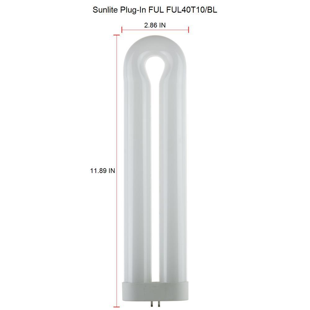 The Sunlite 40-Watt FUL T10 blacklight bulb (BLB) emits ultraviolet (UV-A) light at 368nm color wave-length perfect for lighting up reactive surfaces while not illuminating the surrounding areas. Ideal for creating a glow effect with colors like true white and neon hues for parties, clubs and Halloween decorations. Great for attracting insects to bug zappers. Can also be used for verifying security features on ID cards and currency and detecting pet stains on carpets or furniture that are not otherwise visible to the naked eye. GX10q 4-Pin base works with a variety of lamps and fixtures. Long 5,000-hour life span.