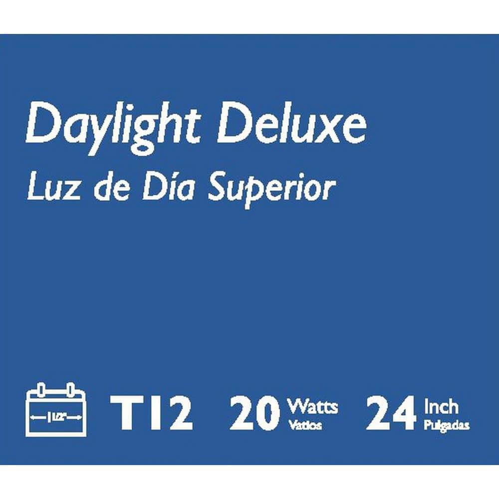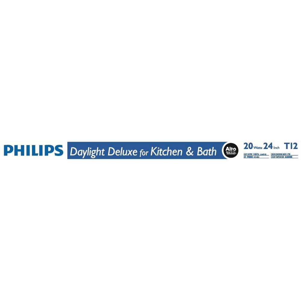 This 2 ft. Philips T12 ALTO fluorescent tube delivers crisp Daylight Deluxe 6500K light ideal for task areas like kitchens, baths, and workshops. It uses 20 watts to produce 1075 lumens, features a medium bi-pin G13 base, and is designed for long-life performance up to 9,000 hours.